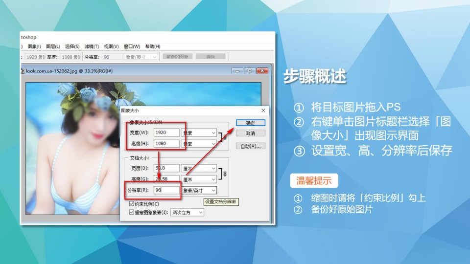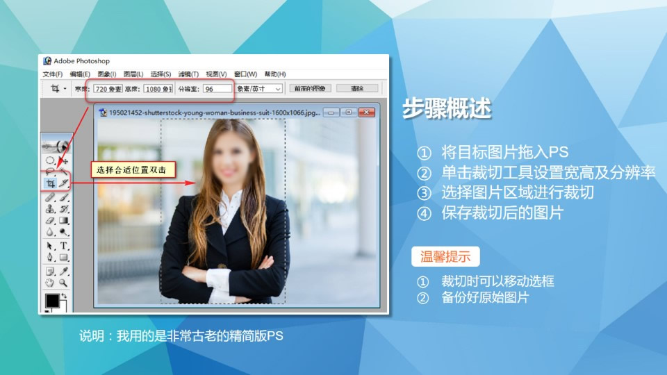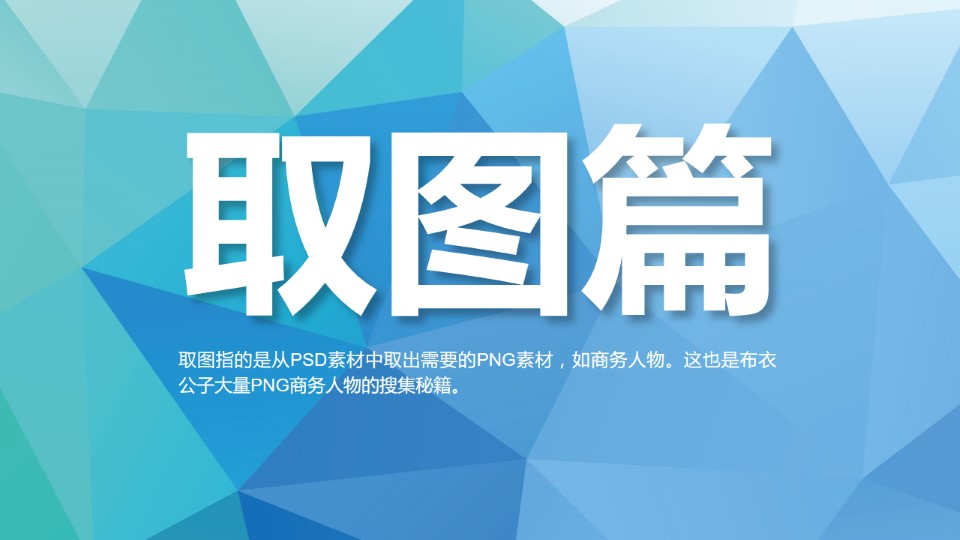 :辅助PPT的常用PS功夫,布衣公子网络微课,裁图篇:重点推荐多个图片裁剪为统一尺寸的情况,应用场景如年度员工颁奖PPT中优秀员工照片事先裁剪为统一尺寸,可更高效制作PPT。缩图篇:对较多图片进行精细化压缩时,使用PS更快捷方便,可以精确设置宽、高、分辨率然后保存即可。取图篇:取图指的是从PSD素材中取出需要的PNG素材,如商务人物。这也是布衣公子大量PNG商务人物的搜集秘籍。