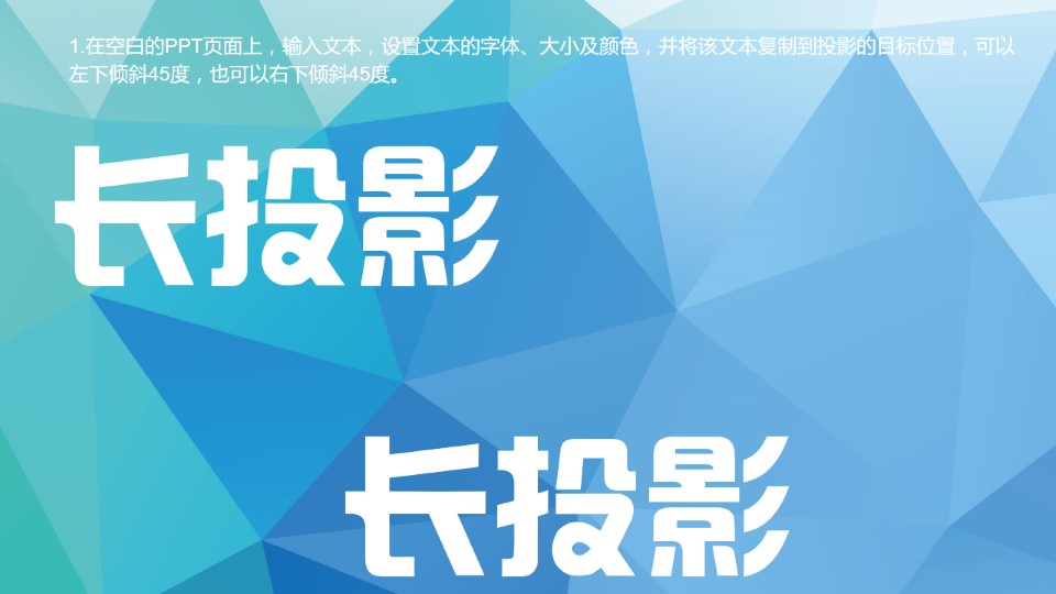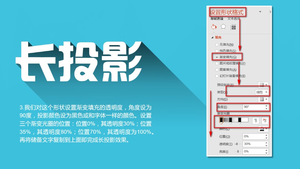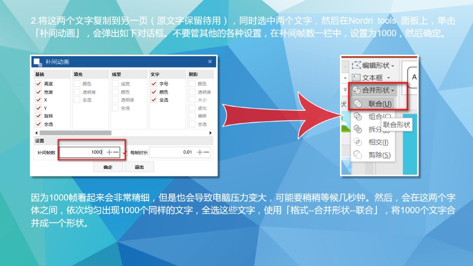 :Nordri Tools 插件补间动画制作长投影,1.在空白的PPT页面上,输入文本,设置文本的字体、大小及颜色,并将该文本复制到投影的目标位置,可以左下倾斜45度,也可以右下倾斜45度。2.将这两个文字复制到另一页(原文字保留待用),同时选中两个文字,然后在Nordri tools 面板上,单击「补间动画」,会弹出如下对话框。不要管其他的各种设置,在补间帧数一栏中,设置为1000,然后确定。3.我们对这个形状设置渐变填充的透明度,角度设为90度,投影颜色设为黑色或和字体一样的颜色。设置三个渐变光圈的位置:位置0%,其透明度30%;位置35%,其透明度80%;位置70%,其透明度为100%。再将储备文字复制到上面即完成长投影效果。