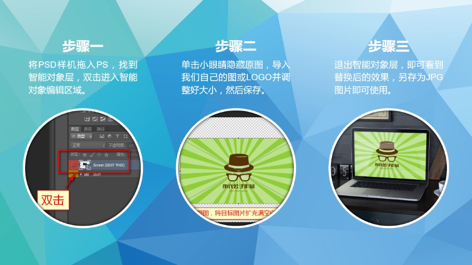 :步骤一:将PSD样机拖入PS,找到智能对象层,双击进入智能对象编辑区域。步骤二:单击小眼睛隐藏原图,导入我们自己的图或LOGO并调整好大小,然后保存。步骤三:退出智能对象层,即可看到替换后的效果,另存为JPG图片即可使用。