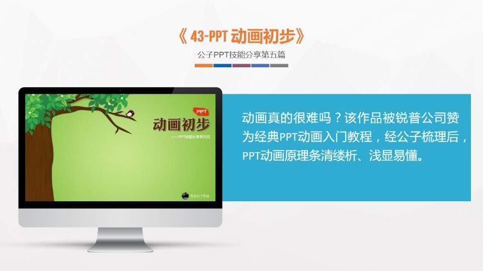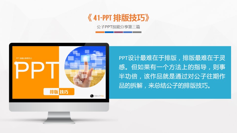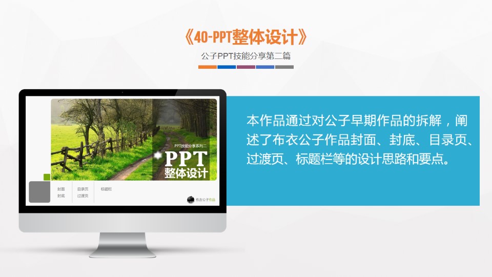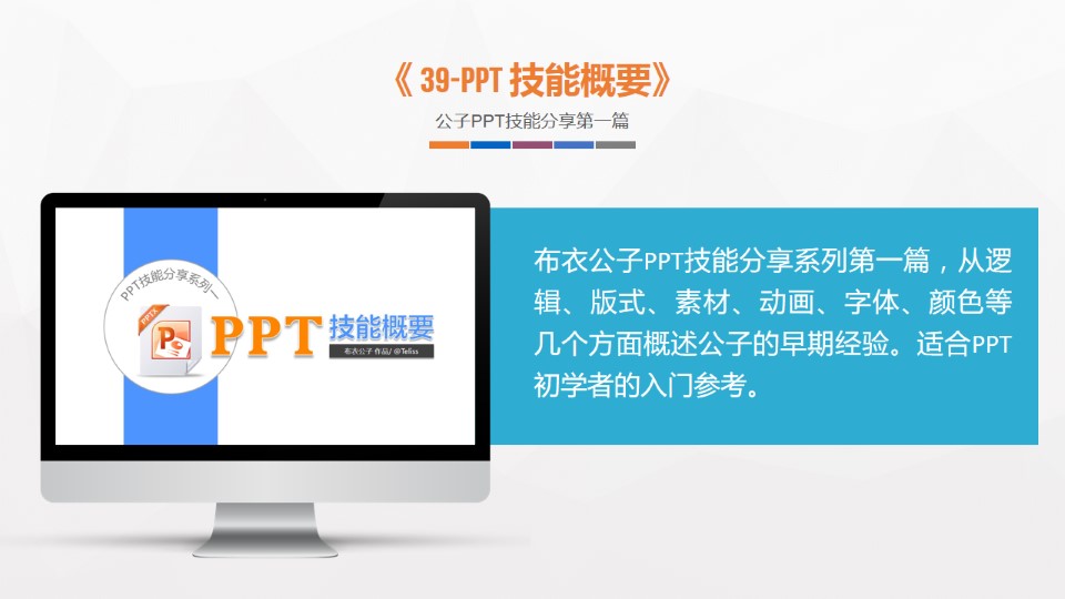 :《 39-PPT 技能概要》公子PPT技能分享第一篇,布衣公子PPT技能分享系列第一篇,从逻辑、版式、素材、动画、字体、颜色等几个方面概述公子的早期经验。适合PPT初学者的入门参考。《40-PPT整体设计》公子PPT技能分享第二篇,本作品通过对公子早期作品的拆解,阐述了布衣公子作品封面、封底、目录页、过渡页、标题栏等的设计思路和要点。