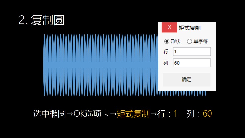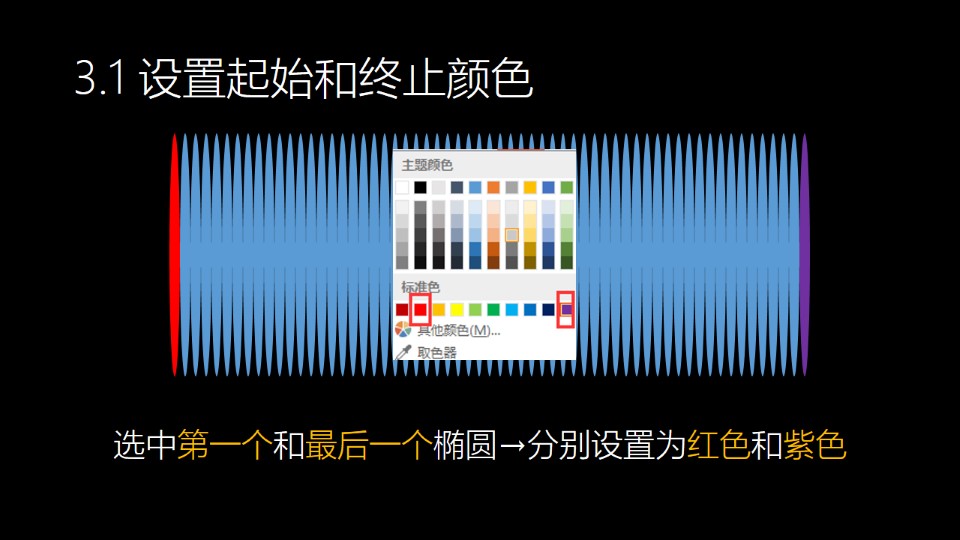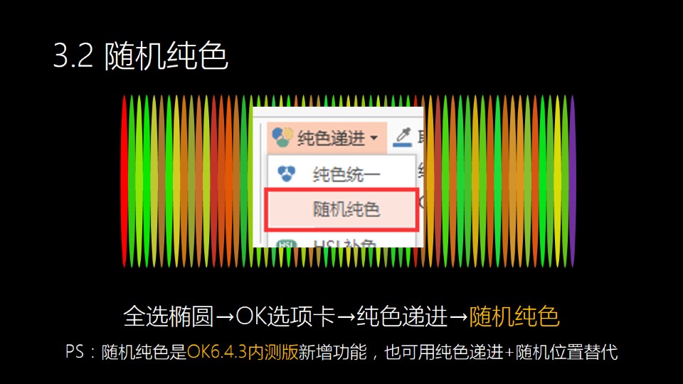 :OK插件综合运用之绚丽线条,1. 插入圆:“插入”选项卡→形状→椭圆→边框设置为无→尺寸如图拉窄;2. 复制圆:选中椭圆→OK选项卡→矩式复制→行:1 列:60;3.1 设置起始和终止颜色:选中第一个和最后一个椭圆→分别设置为红色和紫色;3.2 随机纯色:全选椭圆→OK选项卡→纯色递进→随机纯色;PS:随机纯色是OK6.4.3内测版新增功能,也可用纯色递进+随机位置替代。