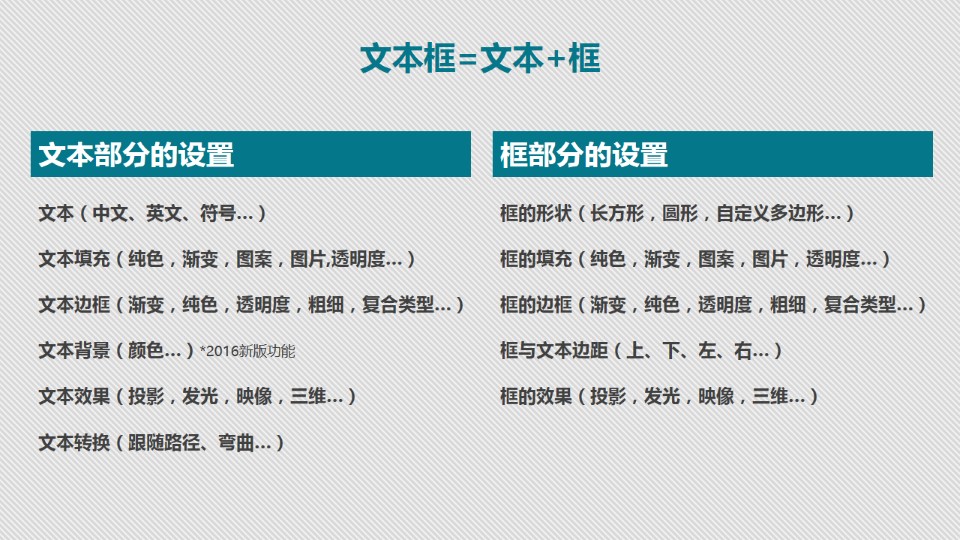 :今天玩了一上午文本框,一个简单的文本框,原来也有很多变化。你有没有留意过这样一个小小的文本框?文本框=文本+框:文本部分的设置;框部分的设置,以下每个页面,只用了一个文本框,限制你的不是技术,而是思维!