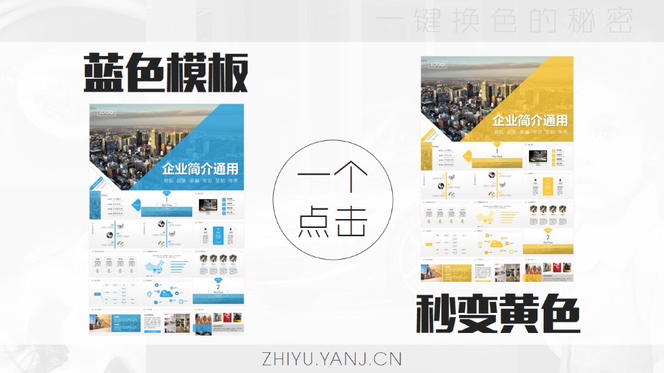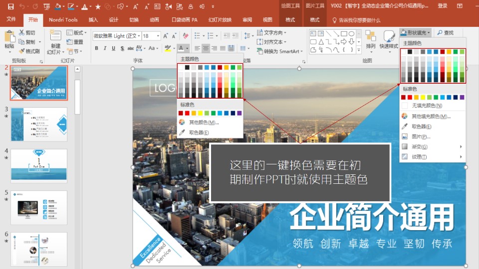 :1分钟告诉你,一键换色的秘密,什么是PPT模板一键换色,一键换色是怎么做的,设置主题色,这里的一键换色需要在初期制作PPT时就使用主题色,在开始社会幻灯片时,先将需要的配色通过自定义颜色配置在主题色中。当整个幻灯片完成后,如果还需要更换配色就非常简单,只需重新找到设计好的主题色,点击任意一组颜色后,即可更换颜色。