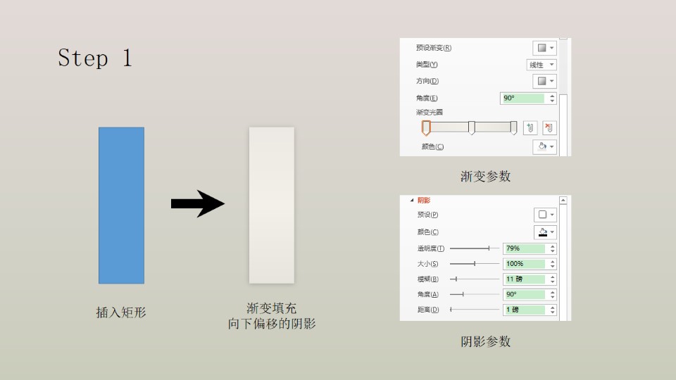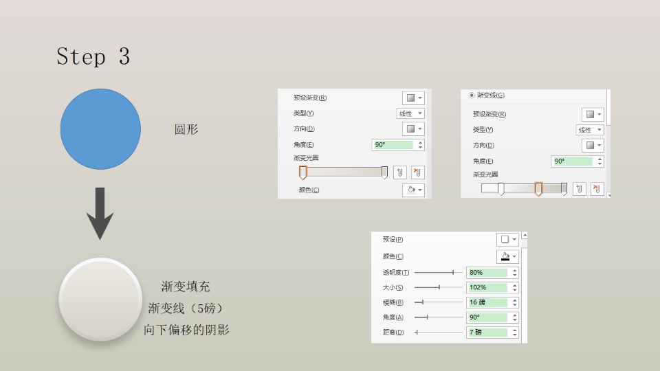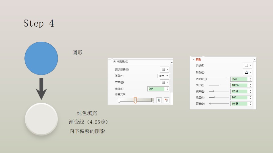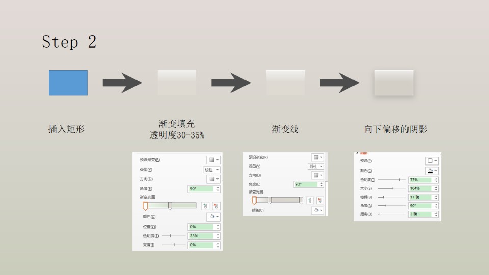 :第一步:插入矩形,渐变填充向下偏移的阴影,阴影参数;第二步:插入矩形,渐变填充透明度30-35%,渐变线,向下偏移的阴影;第三步:圆形,渐变填充,渐变线(5磅),向下偏移的阴影;第四步:圆形,纯色填充渐变线(4.25磅),向下偏移的阴影。