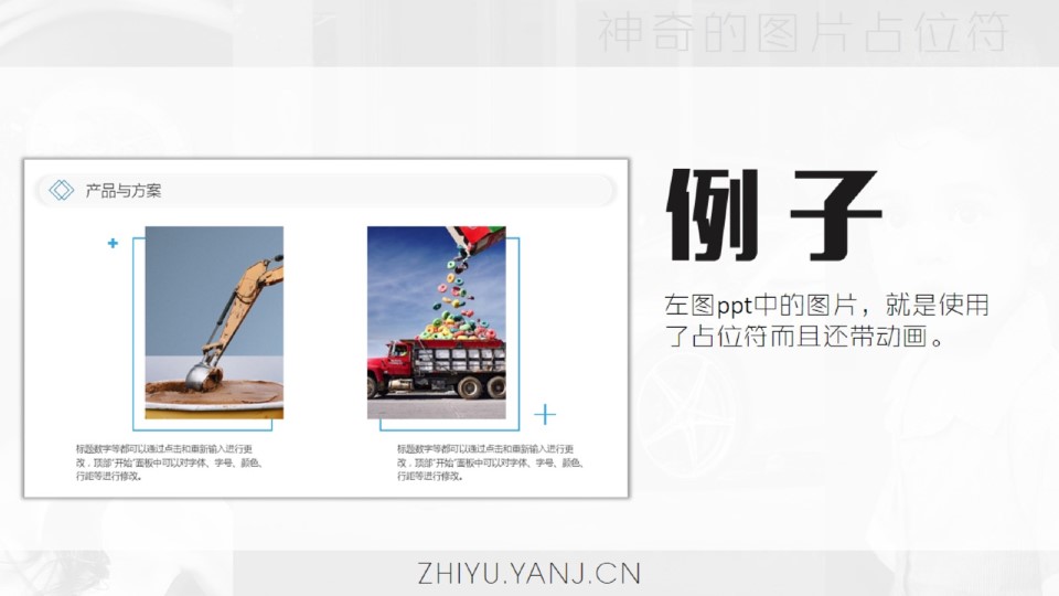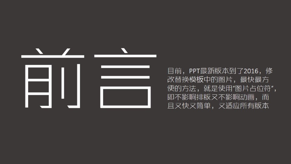 :神奇的图片占位符:目前,PPT最新版本到了2016,修改替换模板中的图片,最快最方便的方法,就是使用“图片占位符”,既不影响排版又不影响动画,而且优快又简单,又适应所有版本,教程目录:1、使用“图片占位符”的ppt模板修改;2、图片占位符的创建和编辑。
