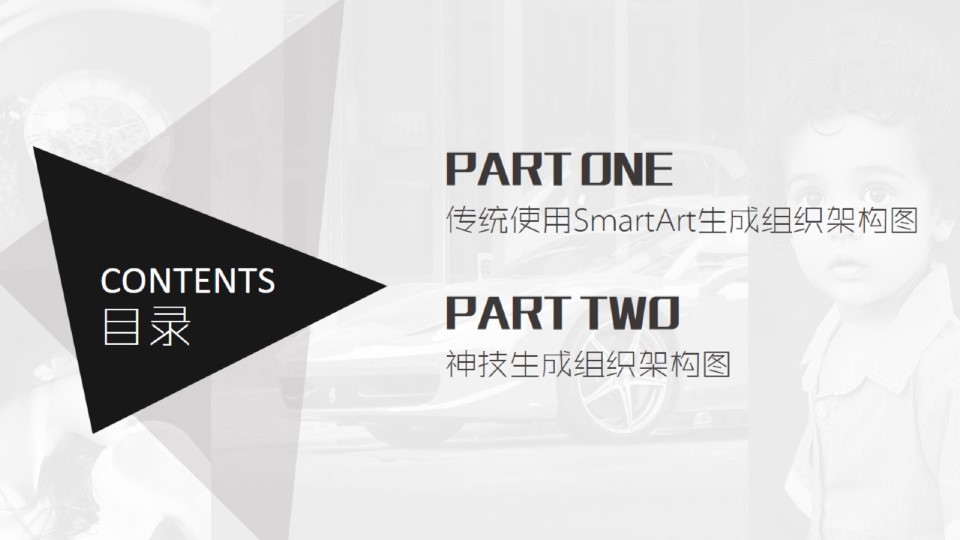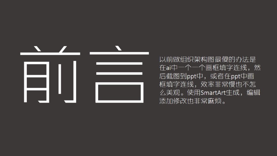 :一键生成组织架构图神技,以前做组织架构图最傻的办法是在ai中一个一个画框填字连线,然后截图到ppt中,或者在ppt中画框填字连线,效率非常慢也不怎么美观,使用SmartArt生成,编辑添加修改页非常麻烦,目录:1、传统使用SmartArt生成组织架构图,2、神技生成组织架构图。