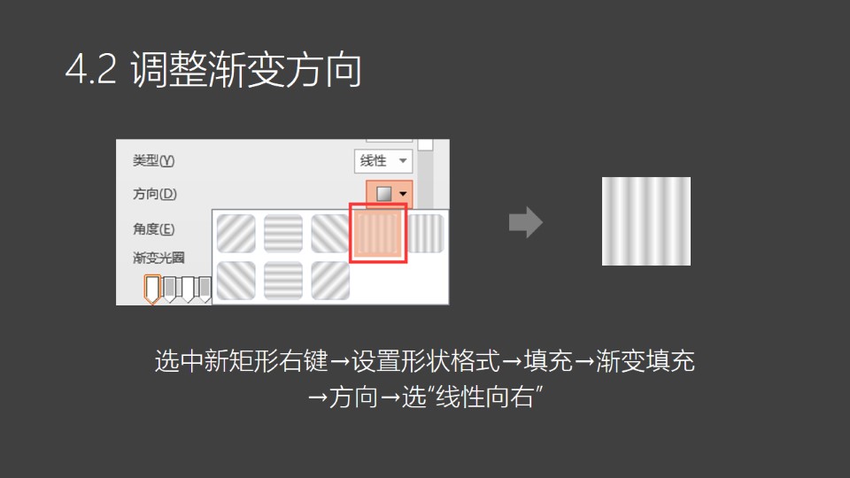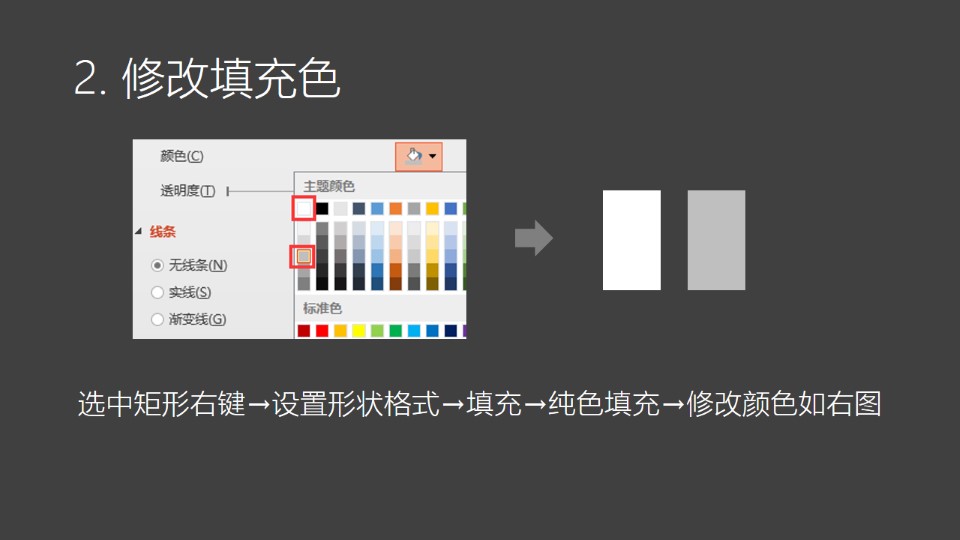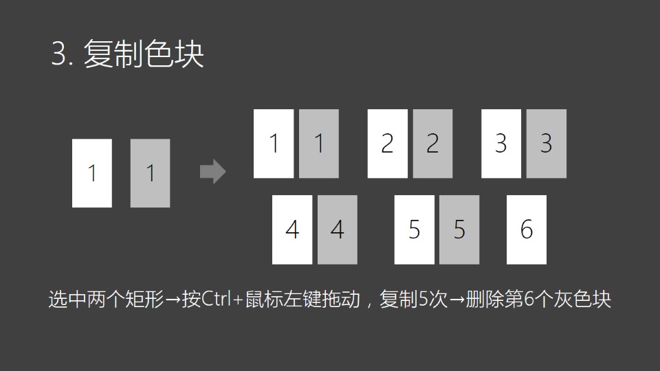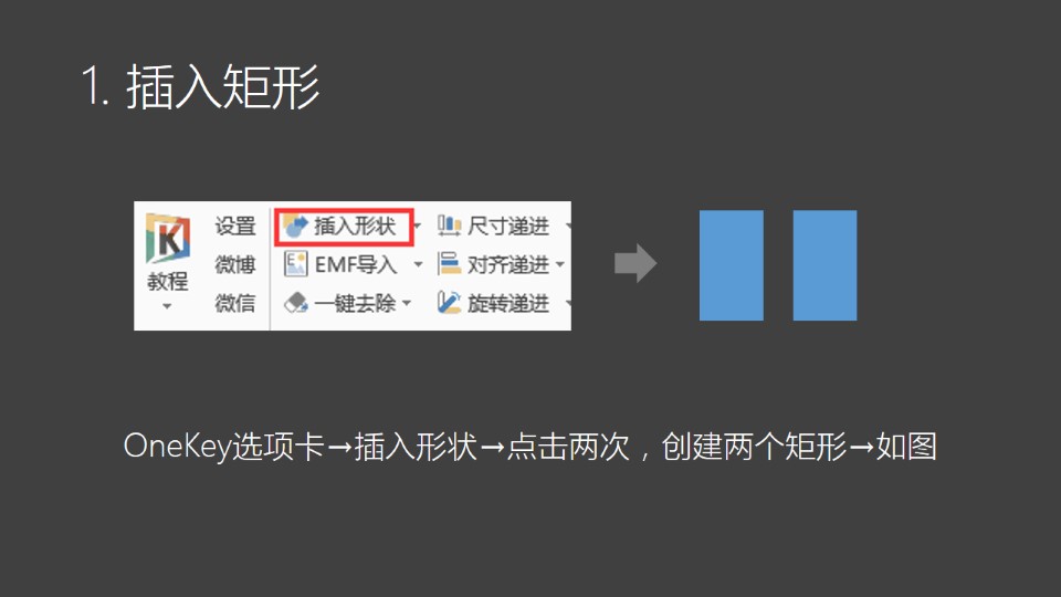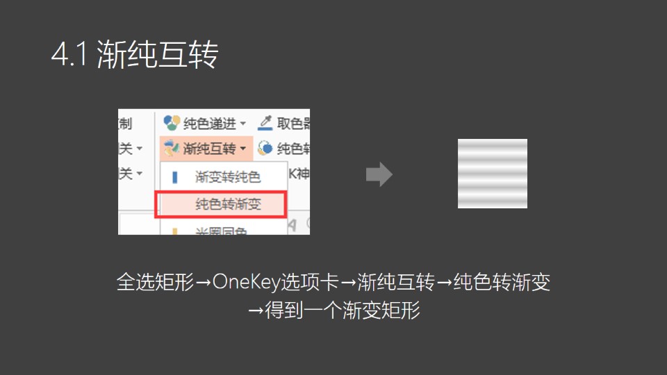 :图片极坐标1:1. 插入矩形:OneKey选项卡→插入形状→点击两次,创建两个矩形→如图;2. 修改填充色:选中矩形右键→设置形状格式→填充→纯色填充→修改颜色如右图;3. 复制色块:选中两个矩形→按Ctrl+鼠标左键拖动,复制5次→删除第6个灰色块;4.1 渐纯互转:全选矩形→OneKey选项卡→渐纯互转→纯色转渐变→得到一个渐变矩形。