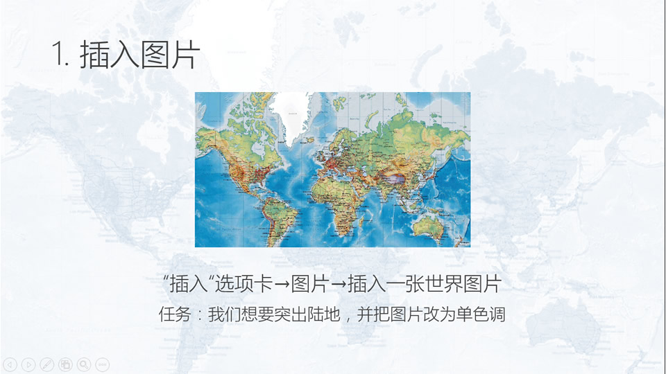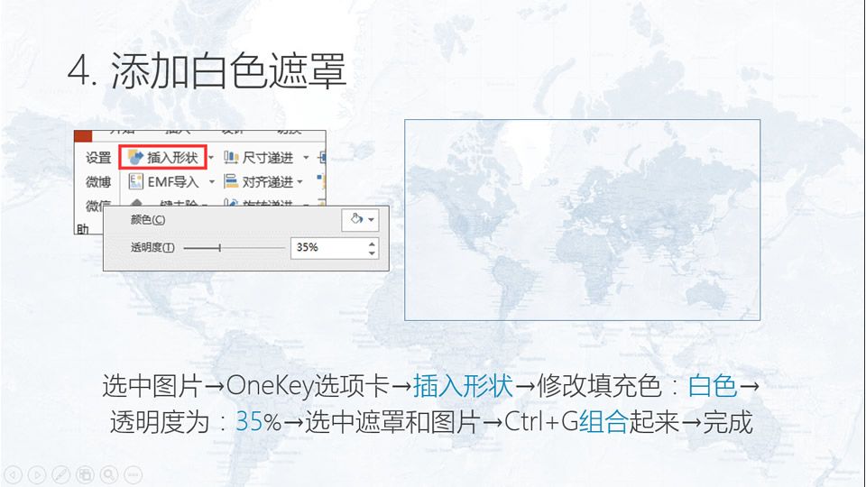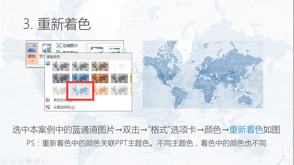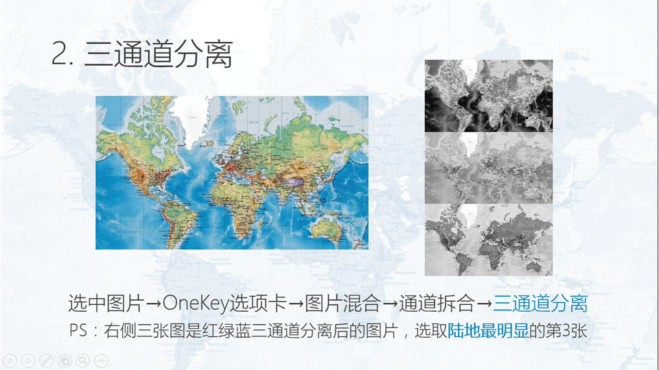导读:通道拆合1:1. 插入图片:“插入“选项卡→图片→插入一张世界图片(任务:我们想要突出陆地,并把图片改为单色调); 2. 三通道分离:选中图片→OneKey选项卡→图片混合→通道拆合→三通道分离(PS:右侧三张图是红绿蓝三通道分离后的图片,选取陆地最明显的第3张);3. 重新着色:选中本案例中的蓝通道图片→双击→“格式”选项卡→颜色→重新着色如图。标签通道拆合,OK插件特别教程,OneKeyTools教程
