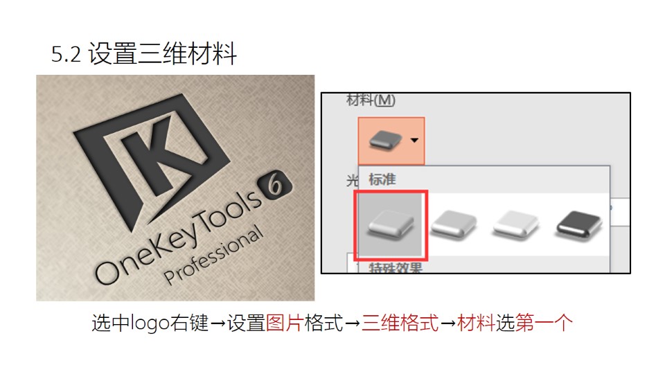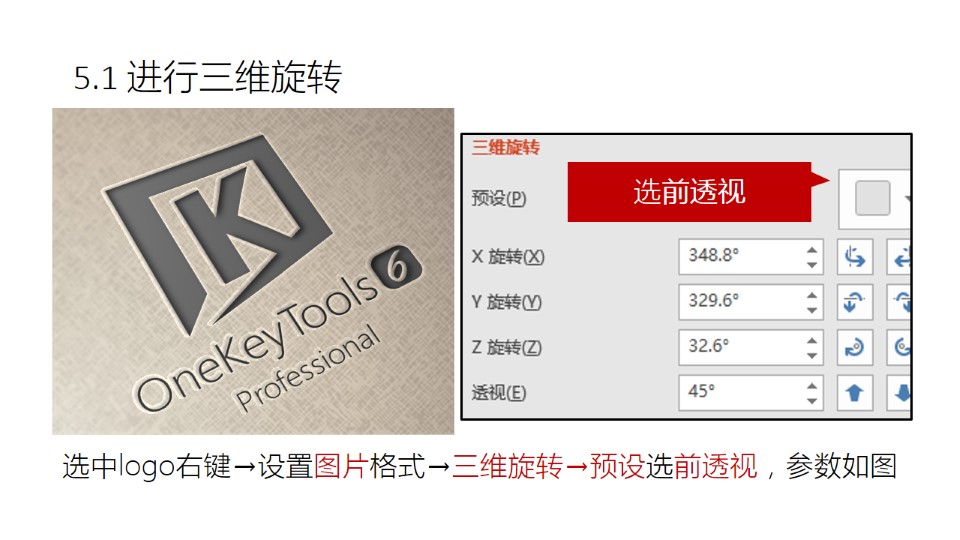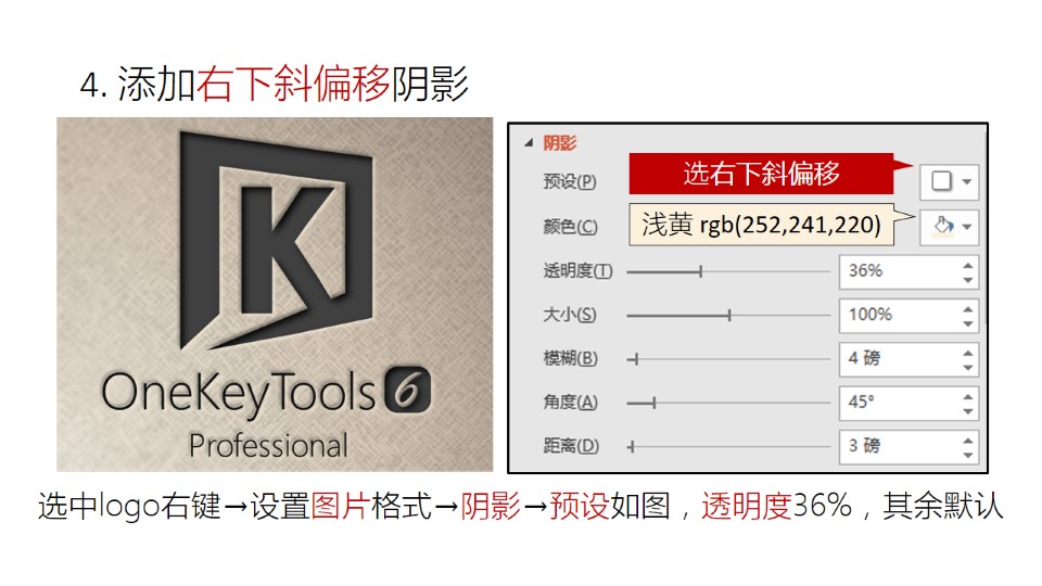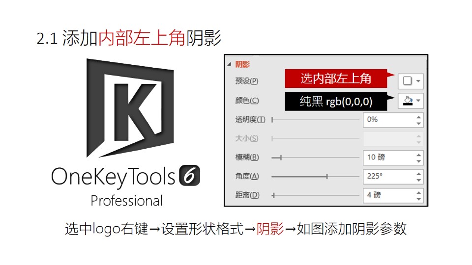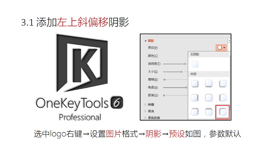 导读:1. 矢量图标设置填充:选中矢量logo→ 填充灰色(rgb:64,64,64);2.1 添加内部左上角阴影:选中logo右键→设置形状格式→阴影→如图添加阴影参数;2.2 一键转图:选中logo→OneKey选项卡→一键转图;3.1 添加左上斜偏移阴影:选中logo右键→设置图片格式→阴影→预设如图,参数默认;3.2 一键转图:选中logo→OneKey选项卡→再次一键转图;4. 添加右下斜偏移阴影:选中logo右键→设置图片格式→阴影→预设如图,透明度36%,其余默认;5.1 进行三维旋转:选中logo右键→设置图片格式→三维旋转→预设选前透视,参数如图;5.2 设置三维材料:选中logo右键→设置图片格式→三维格式→材料选第一个。