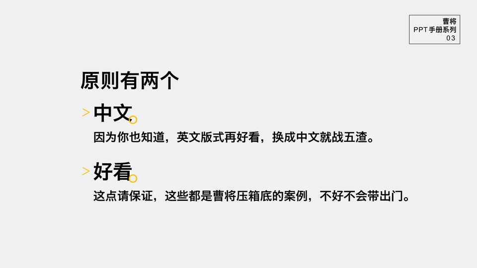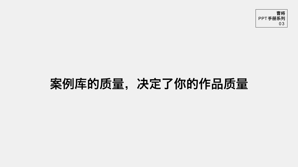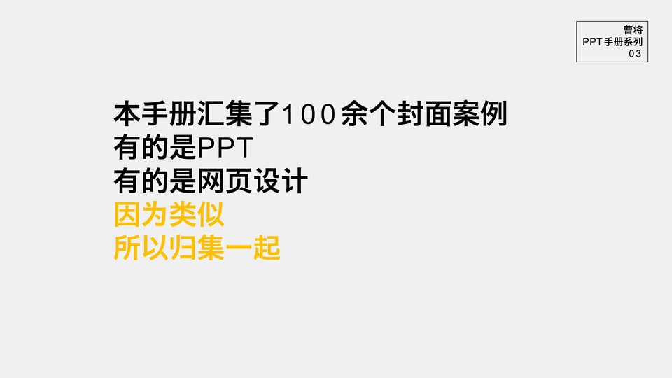 :案例库的质量,决定了你的作品质量,本手册汇集了100余个封面案例,有的是ppt,有的是网页设计,因为类似,所以归集一起,原则有两个,中文:因为你也知道,英文版式再好看,换成中文就战五渣;好看:这点请保证,这些都是曹将压箱底的案例,不好不会带出门。