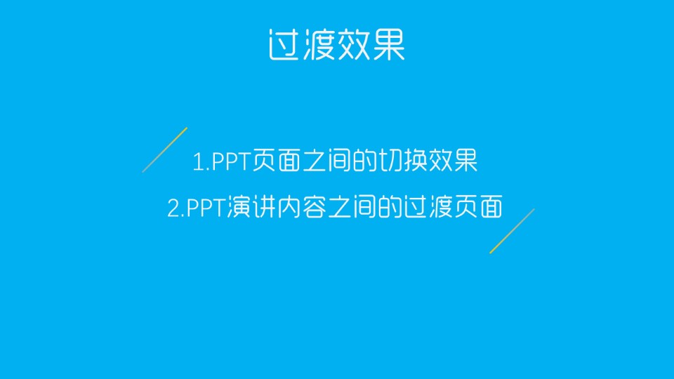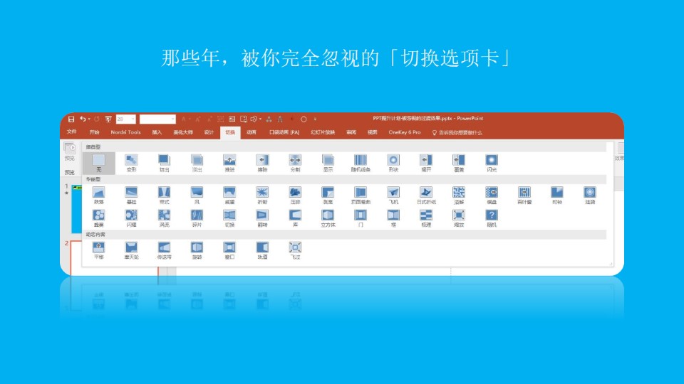 :被忽视的过渡效果,何为过渡效果?1、ppt页面之间的切换效果:那些年,被你完全忽视的“切换选项卡”,增加切换效果之后,可以让你的ppt切换时显得更加自然;2、ppt演讲内容之间的过渡页面:一般以即将演讲的内容(小标题)单独成一页,结束语:虽然这都是细节上的东西,但是在你的PPT中加上之后能够起到很大的加分作用。切换效果有非常多,在合适的场合选择合适的效果就显得尤为重要。打开你的PPT,玩玩不同的切换效果吧!