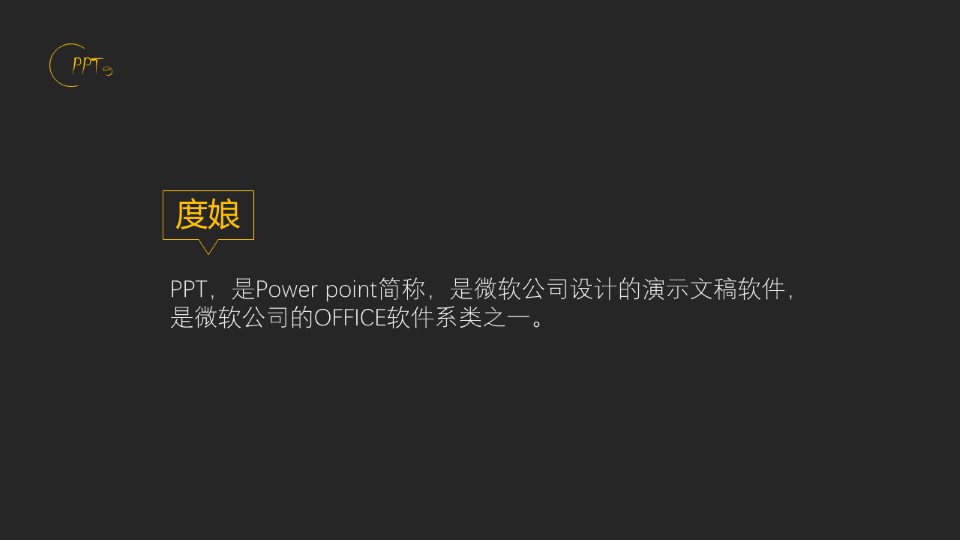 :P圈老司机,你造这些吗?1、ppt是什么?PPT是PowerPoint的简称,是微软公司设计的演示文稿软件,是微软公司的OFFICE软件系类之一;2、为什么学PPT?Make your point power.协助演讲者的演讲,使重点突出,PPT的功能越来越强大,被广泛地应用。