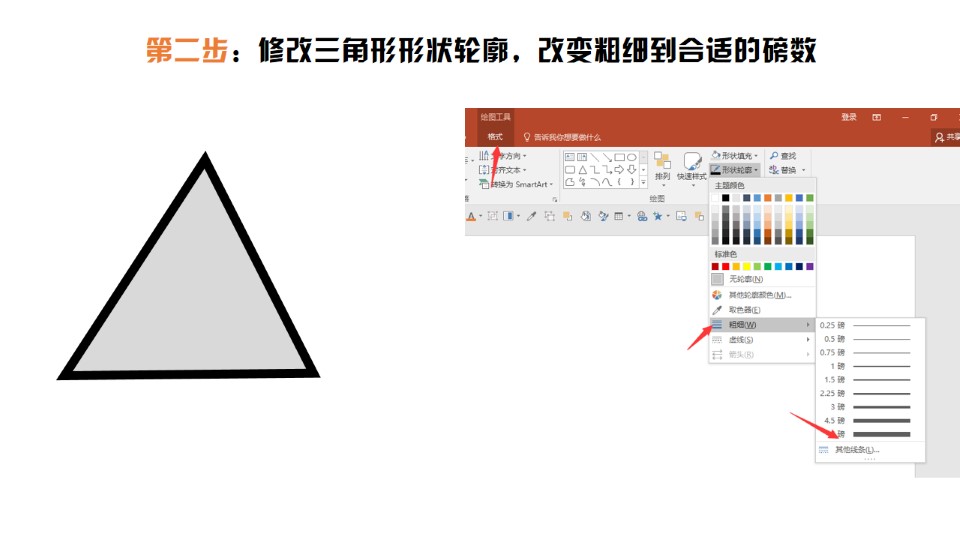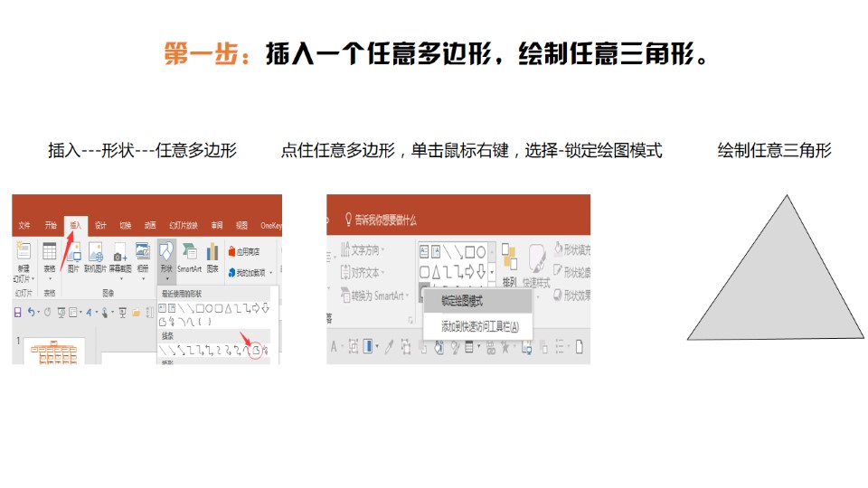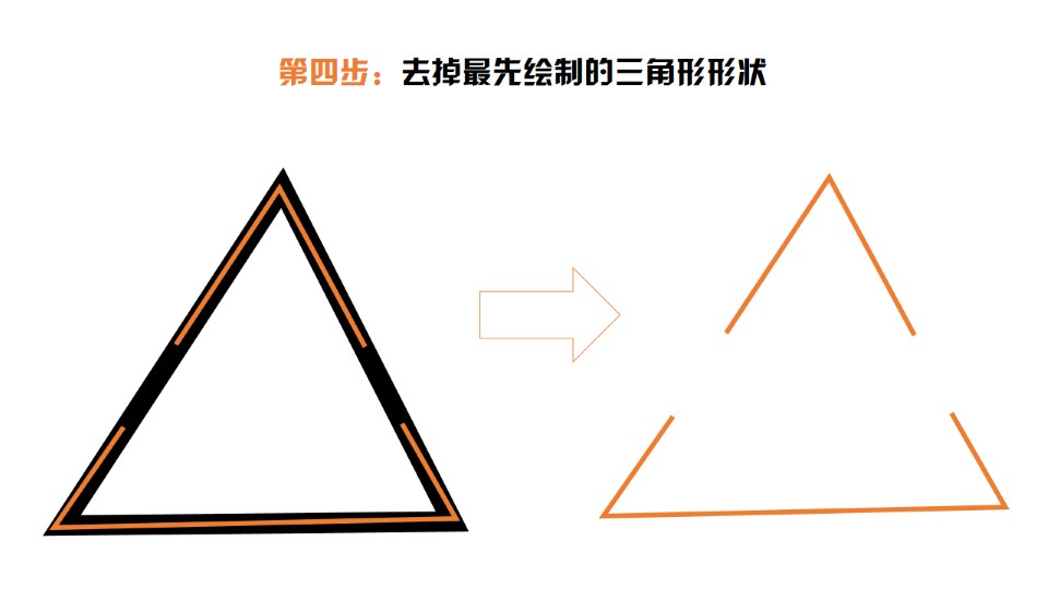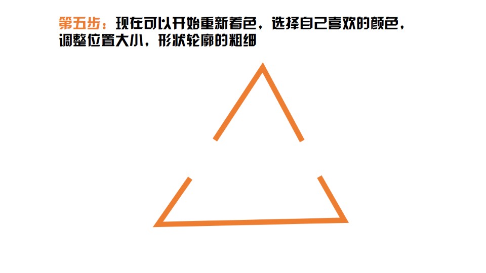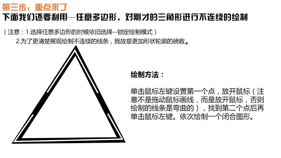 :三分钟教会你绘制不连续的线条,第一步:插入一个任意多边形,绘制任意三角形;第二步:修改三角形形状轮廓,改变粗细到合适的磅数;第三步:重点来了,下面我们还要利用—任意多边形,对刚才的三角形进行不连续的绘制;第四步:去掉最先绘制的三角形形状;第五步:现在可以开始重新着色,选择自己喜欢的颜色,调整位置大小,形状轮廓的粗细;第六步:插入文字形状(选择合适的字体),进行排版;第七步:完成图,你是不是学会了?