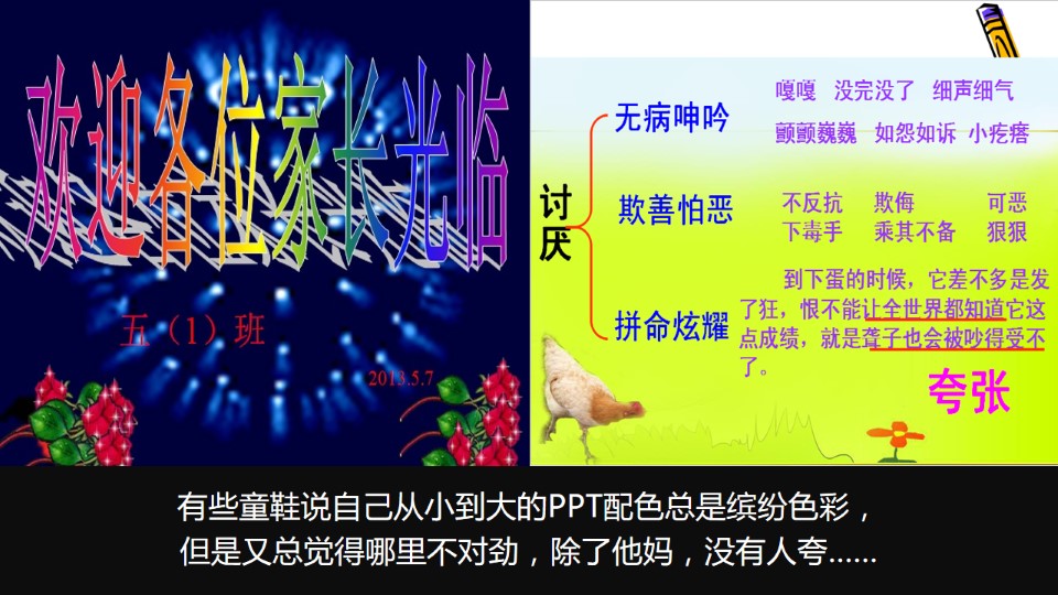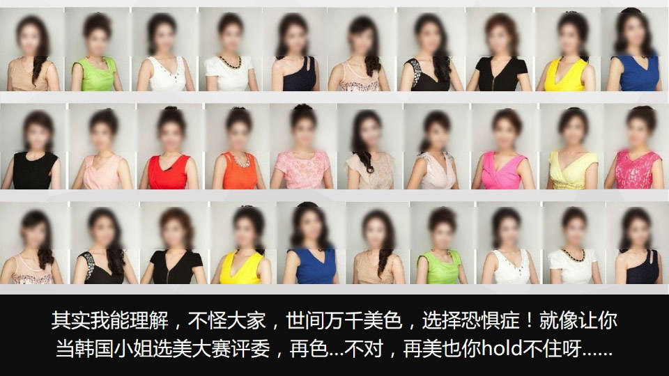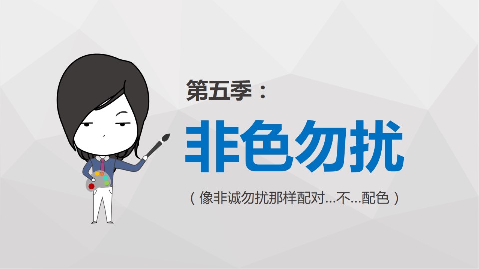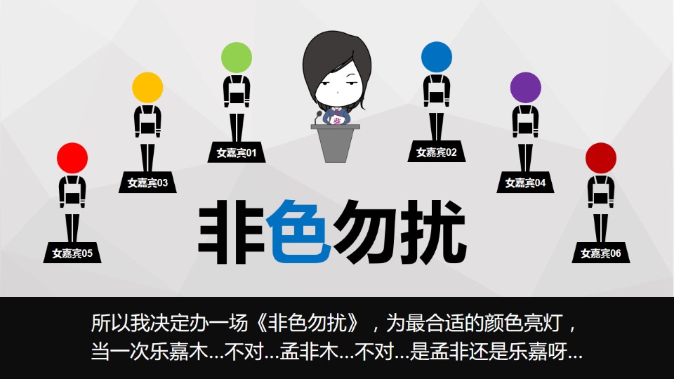 :有些童鞋说自己从小到大的PPT配色总是缤纷色彩,但是又总觉得哪里不对劲,除了他妈,没有人夸……其实我能理解,不怪大家,世间万千美色,选择恐惧症!就像让你当韩国小姐选美大赛评委,再色…不对,再美也你hold不住呀……所以我决定办一场《非色勿扰》,为最合适的颜色亮灯,当一次乐嘉木…不对…孟非木…不对…是孟非还是乐嘉呀…