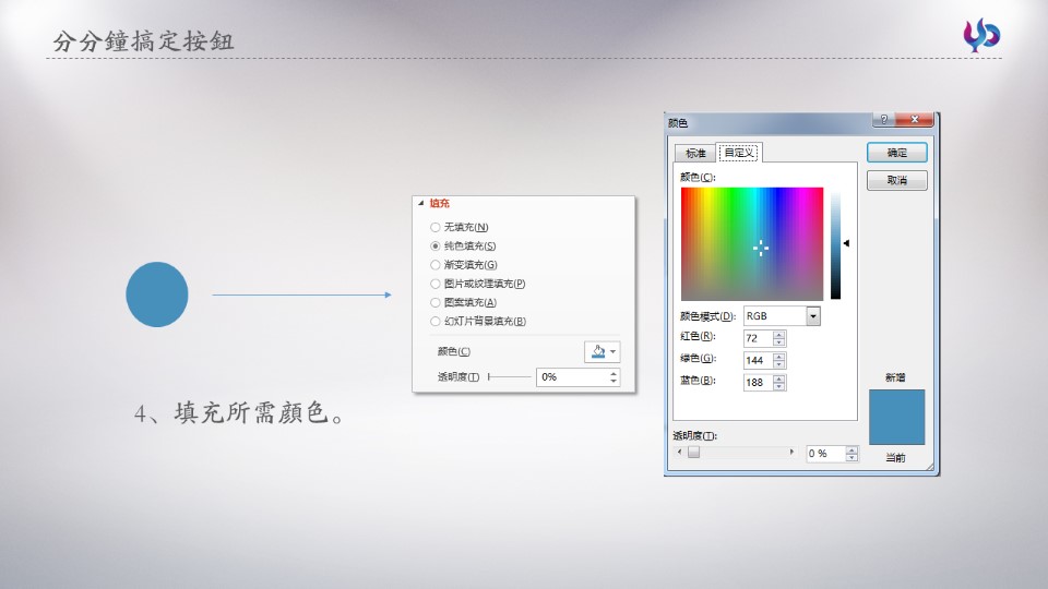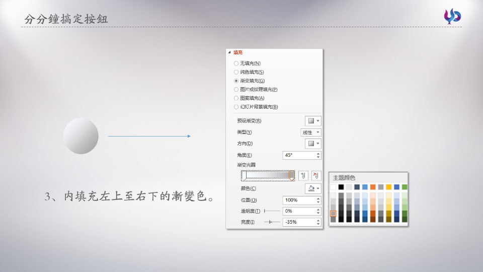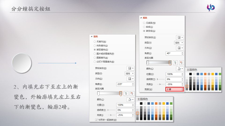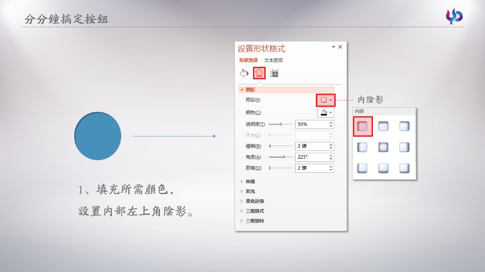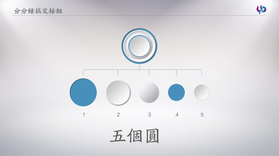 :分分钟搞定按钮,五个圆,1、填充所需要颜色,设置内部左上角阴影;2、内填充右下至左上角渐变色,外轮廓填充左上至右下渐变色,轮廓2磅;3、内填充左上至右下的渐变色;4、填充所需颜色;5、内填充右下至左上渐变色,外轮廓填充左上至右下的渐变色,轮廓1磅。