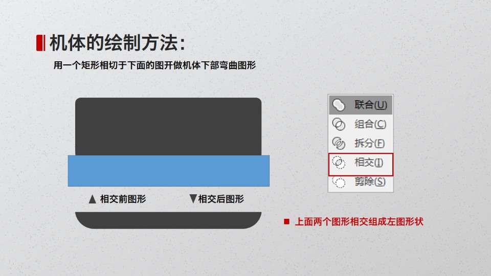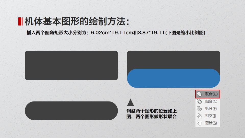 :PPT鼠绘简洁写实质感空调,高逼格效果图:图形分解:机体部分,辅助设备部分,机体基本图形的绘制方法:插入两个圆角矩形大小分别为:6.02cm*19.11cm和3.87*19.11(下图是缩小比例图),调整两个图形的位置如上图,两个图形做形状联合,机体的绘制方法:用一个矩形相切于下面的图开做机体下部弯曲图形,相交前图形,相交后图形,上面两个图形相交组成左图形状。