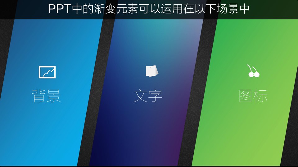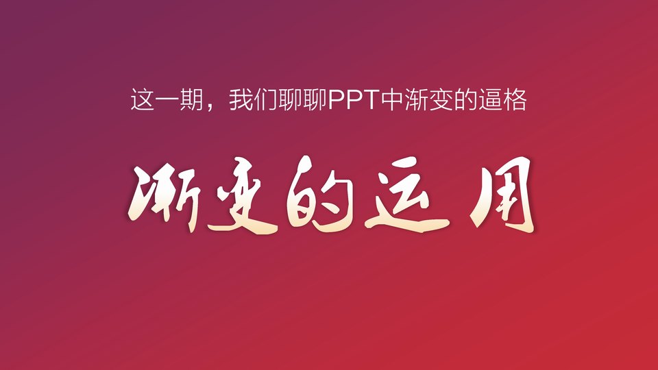 :教程回归了,这一期,我们聊聊PPT中渐变的逼格:渐变的运用,PPT中的渐变元素可以运用在以下场景中,背景、文字、图标,渐变在背景中的运用比比皆是,比如下面这些渐变的背景,珞珈作品、不二素鱼汤作品、演示之家作品,这些背景图或者渐变元素哪里找?事实就是在PPT中制作,理论上很简单,就是两组或多组颜色设置为渐变填充。