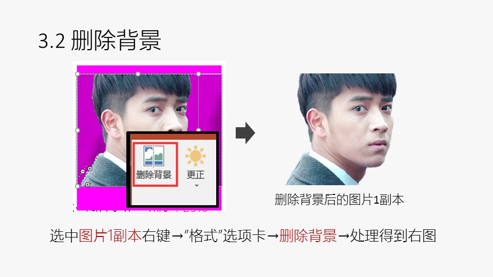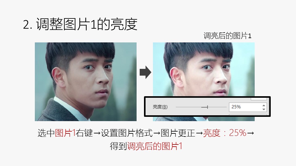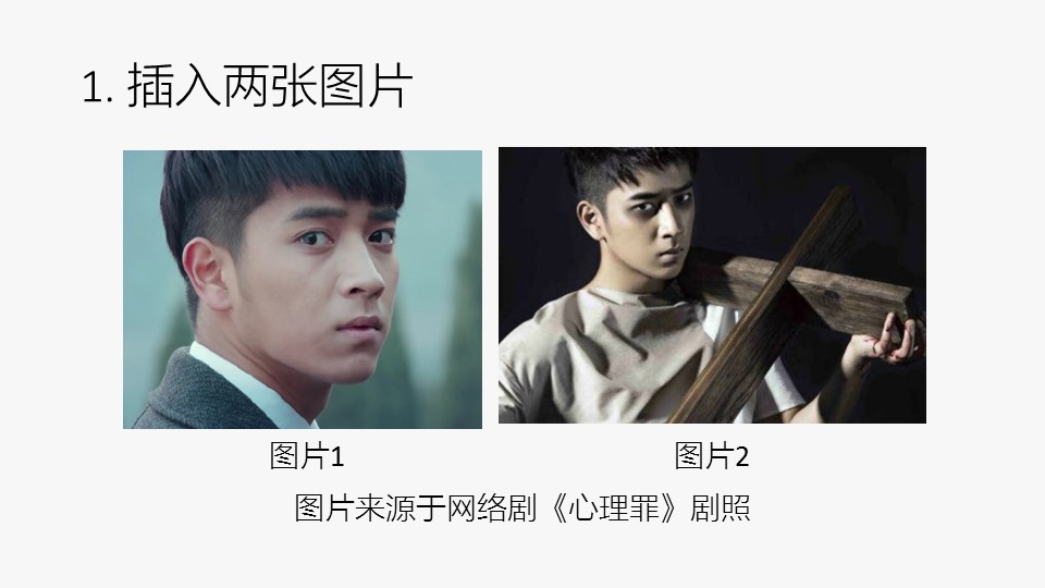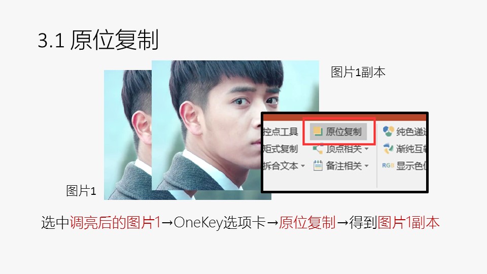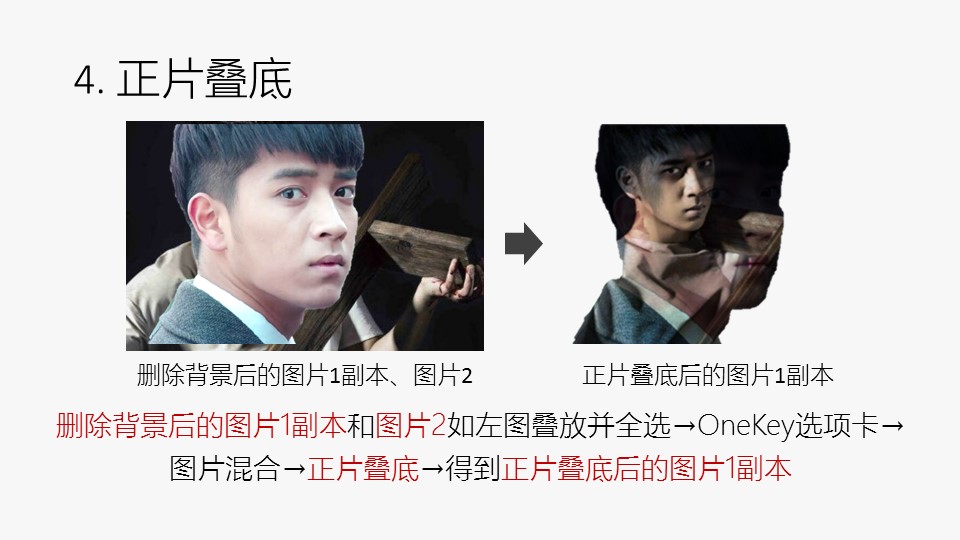 :1. 插入两张图片,图片来源于网络剧《心理罪》剧照;2. 调整图片;1的亮度:选中图片1右键→设置图片格式→图片更正→亮度:25%→得到调亮后的图片1;3.1 原位复制:选中调亮后的图片1→OneKey选项卡→原位复制→得到图片1副本;3.2 删除背景:选中图片1副本右键→”格式”选项卡→删除背景→处理得到右图;4. 正片叠底:删除背景后的图片1副本和图片2如左图叠放并全选→OneKey选项卡→图片混合→正片叠底→得到正片叠底后的图片1副本。
