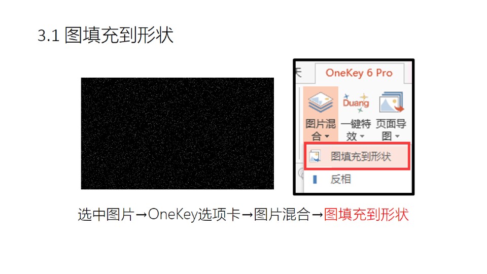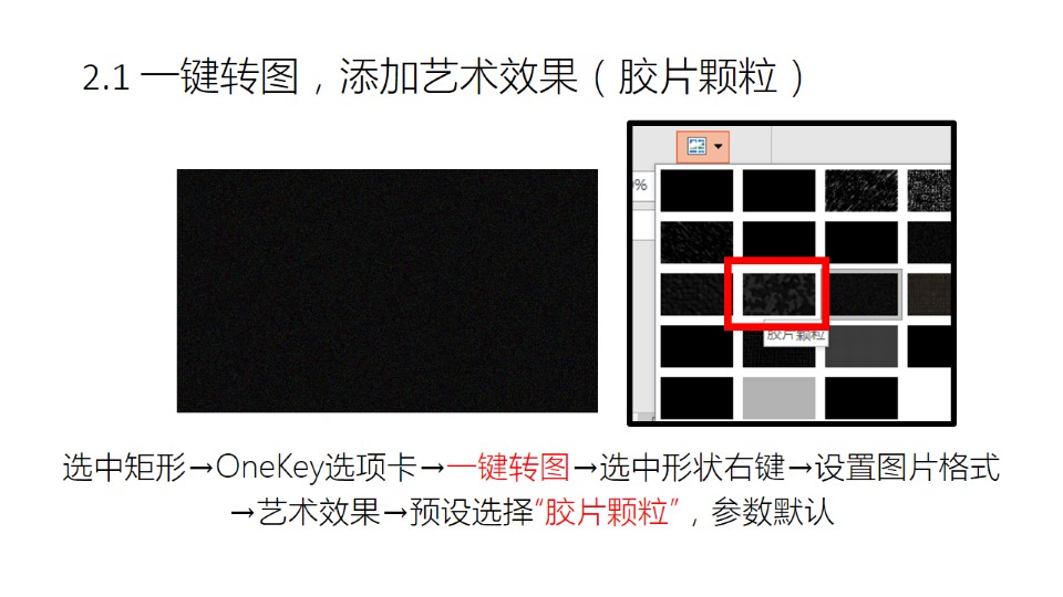 导读:1. 插入矩形,填充为纯黑:OneKey选项卡→插入形状→调整方形尺寸如右图→填充为黑色;2.1 一键转图,添加艺术效果(胶片颗粒)选中矩形→OneKey选项卡→一键转图→选中形状右键→设置图片格式→艺术效果→预设选择“胶片颗粒”,参数默认;2.2 设置饱和度、对比度、亮度:选中图片右键→设置图片格式→图片颜色→饱和度:0→图片更正→对比度:100→亮度:60;3.1 图填充到形状:选中图片→OneKey选项卡→图片混合→图填充到形状。标签大雨,图片混合,OneKeyTools教程
