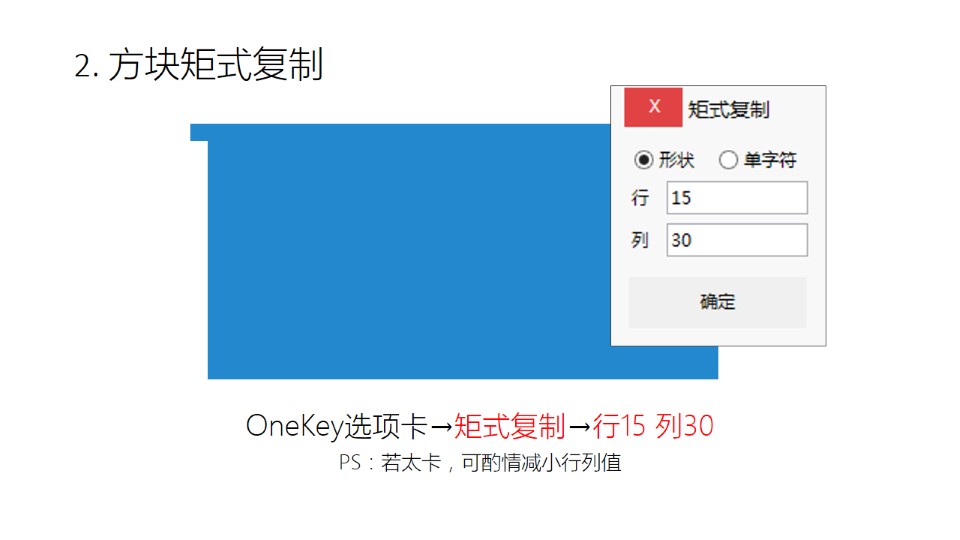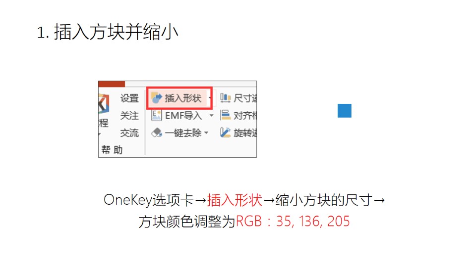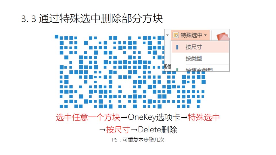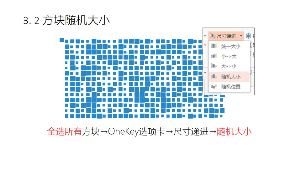 导读:1. 插入方块并缩小:OneKey选项卡→插入形状→缩小方块的尺寸→方块颜色调整为RGB:35, 136, 205;2. 方块矩式复制:OneKey选项卡→矩式复制→行15 列30PS:若太卡,可酌情减小行列值;3. 1 缩小任意一个方块:选中并缩小任意一个方块→全选方块→OneKey选项卡→一键去除→锁定纵横比;3. 2 方块随机大小:全选所有方块→OneKey选项卡→尺寸递进→随机大小;3. 3 通过特殊选中删除部分方块:选中任意一个方块→OneKey选项卡→特殊选中→按尺寸→Delete删除PS:可重复本步骤几次。标签多色方块,OneKeyTools教程