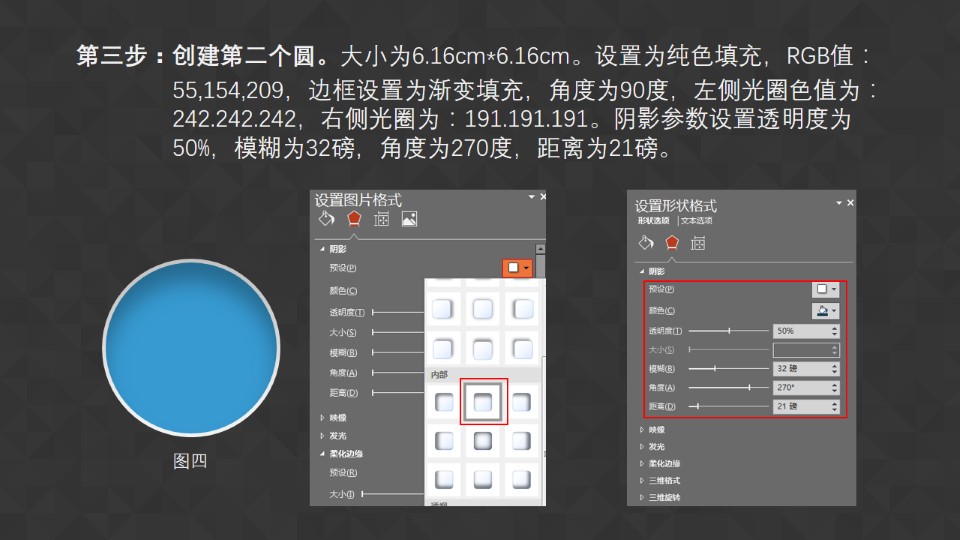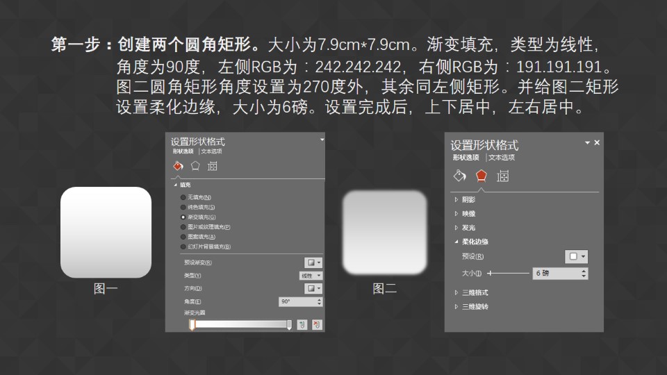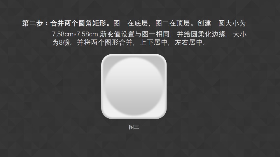 导读:UI风格PPT系列教程(二),PPT手绘微立体指北针ICONS,第一步:创建两个圆角矩形。大小为7.9cm*7.9cm。渐变填充,类型为线性,角度为90度,左侧RGB为:242.242.242,右侧RGB为:191.191.191。图二圆角矩形角度设置为270度外,其余同左侧矩形。并给图二矩形设置柔化边缘,大小为6磅。设置完成后,上下居中,左右居中。第二步:合并两个圆角矩形。图一在底层,图二在顶层。创建一圆大小为,7.58cm*7.58cm,渐变值设置与图一相同,并给圆柔化边缘,大小为8磅。并将两个图形合并,上下居中,左右居中。第三步:创建第二个圆。大小为.16cm*6.16cm。设置为纯色填充,RGB值:55,154,209,边框设置为渐变填充,角度为90度,左侧光圈色值为:242.242.242,右侧光圈为:191.191.191。阴影参数设置透明度为50%,模糊为32磅,角度为270度,距离为21磅。标签指北针,微粒体,icons图标,ui风格,教程