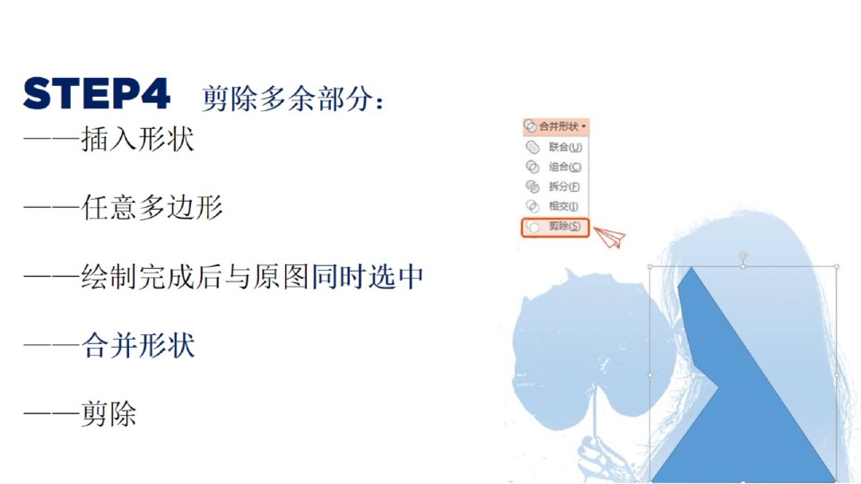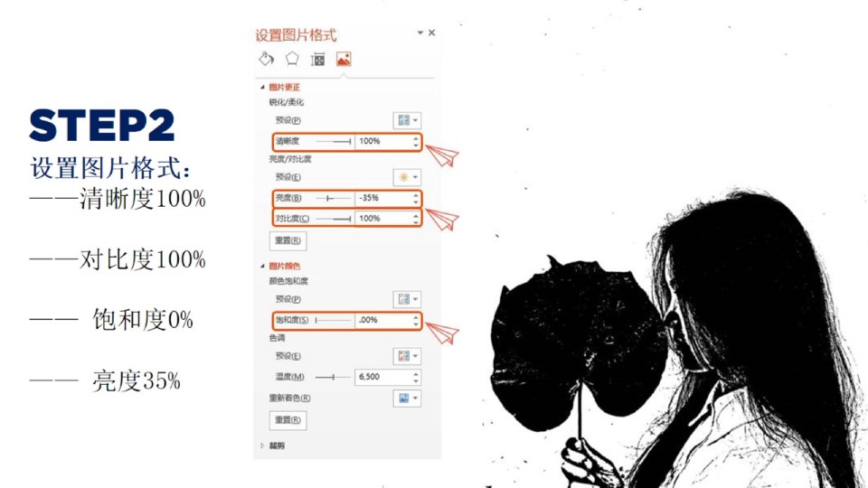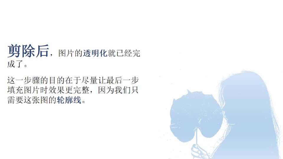导读:第一步:选择一张文艺点的图片,背景色简单偏白最好;第二步:设置图片格式:清晰度100%,对比度100%,饱和度100%,亮度35%;第三步:执行透明化处理:颜色——设置透明色——鼠标点击图片黑色部分;第四步:剪除多余部分:插入图形>任意多边形>绘制完成后与原图同时选中>合并形状>剪除;剪除后,图片的透明化就已经完成了,这一步骤的目的在于尽量让最后一步填充图片时效果更完整,因为我们只需要这张图的轮廓线。标签透明化处理,图片,教程