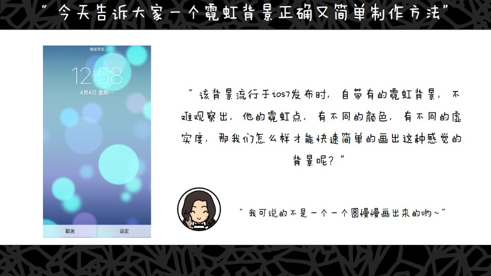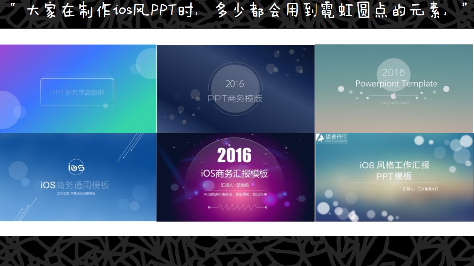 导读:霓虹背景正确制作方法:“ 距离上次出教程,好像有段时间了,”“ 最近新GET一个小技能,在此分享给大家”“ 大家在制作ios风PPT时,多少都会用到霓虹圆点的元素,”“ 今天告诉大家一个霓虹背景正确又简单制作方法”“ 该背景流行于ios7发布时,自带有的霓虹背景,不难观察出,他的霓虹点,有不同的颜色,有不同的虚实度,那我们怎么样才能快速简单的画出这种感觉的背景呢?”“ 我可说的不是一个一个圆慢慢画出来的哟~”“ 首先我们需要借助到一个强大的图像工具:”“ 结合使用,简便又高效”“ 在此,你可以先在PPT做好渐变背景:”“ 然后打开我们的PS,见证奇迹的几步操作就要开始了:”“ 为了配合演示背景,我先在PS里铺好了相同的背景”。