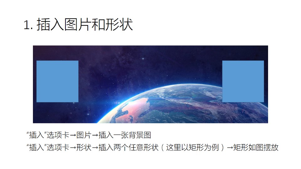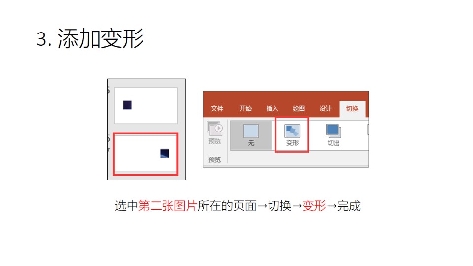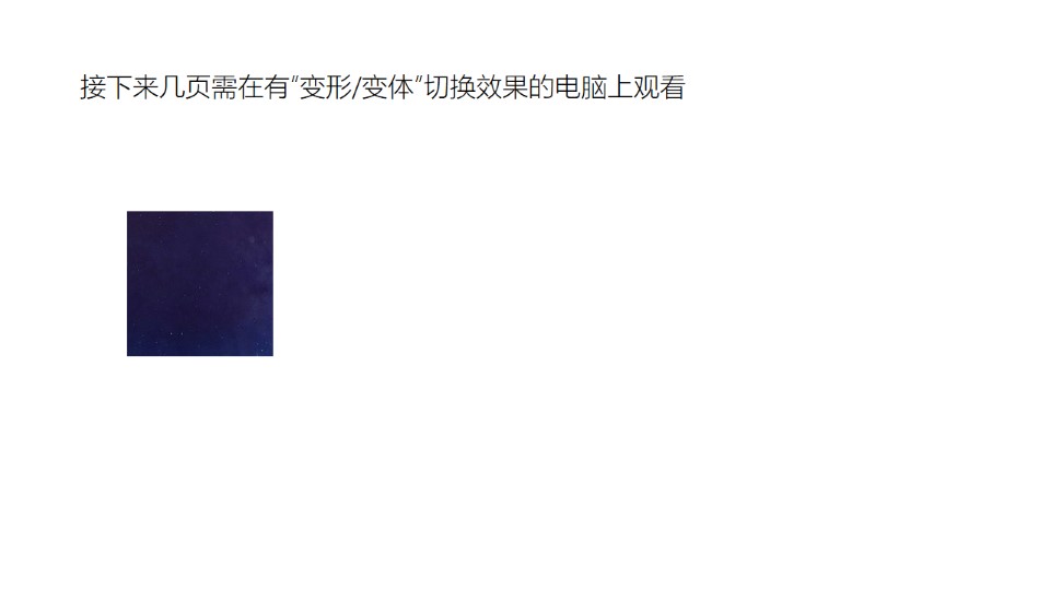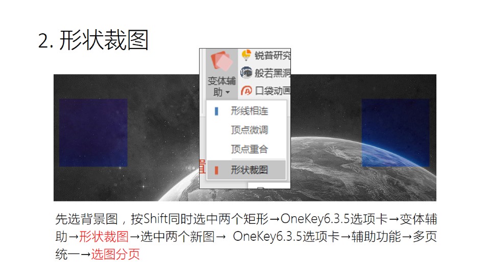 :PPT裁图变形教程:1. 插入图片和形状:“插入”选项卡→图片→插入一张背景图,“插入”选项卡→形状→插入两个任意形状(这里以矩形为例)→矩形如图摆放;2. 形状裁图:先选背景图,按Shift同时选中两个矩形→OneKey6.3.5选项卡→变体辅助→形状裁图→选中两个新图→ OneKey6.3.5选项卡→辅助功能→多页统一→选图分页;3. 添加变形:选中第二张图片所在的页面→切换→变形→完成;接下来几页需在有“变形/变体”切换效果的电脑上观看。