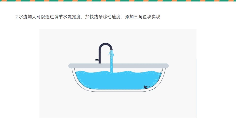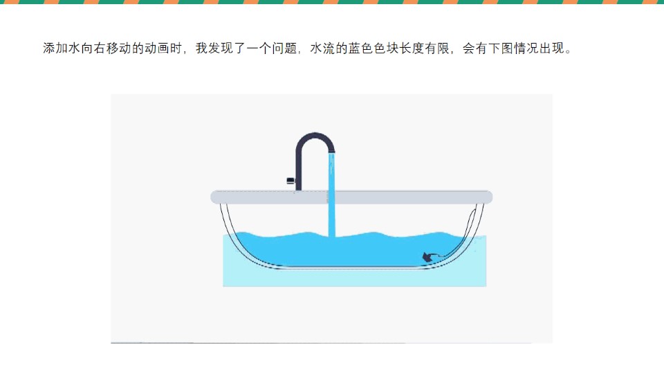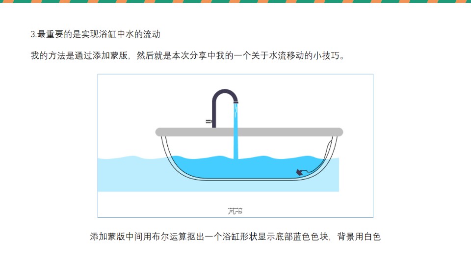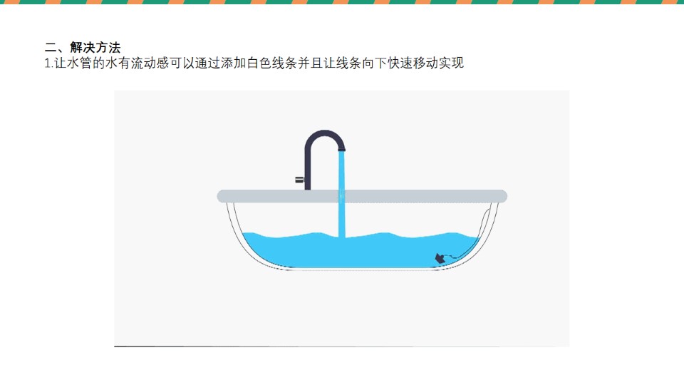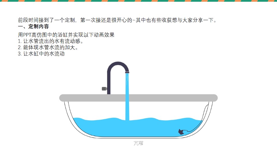 导读:前段时间接到了一个定制,第一次接还是很开心的~其中也有些收获想与大家分享一下,一、定制内容:用PPT高仿图中的浴缸并实现以下动画效果:1. 让水管流出的水有流动感;2. 能体现水管水流的加大;3. 让水缸中的水流动;二、解决方法:1.让水管的水有流动感可以通过添加白色线条并且让线条向下快速移动实现;2.水流加大可以通过调节水流宽度,加快线条移动速度,添加三角色块实现;3.最重要的是实现浴缸中水的流动;我的方法是通过添加蒙版,然后就是本次分享中我的一个关于水流移动的小技巧。