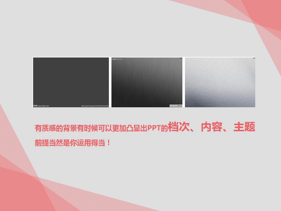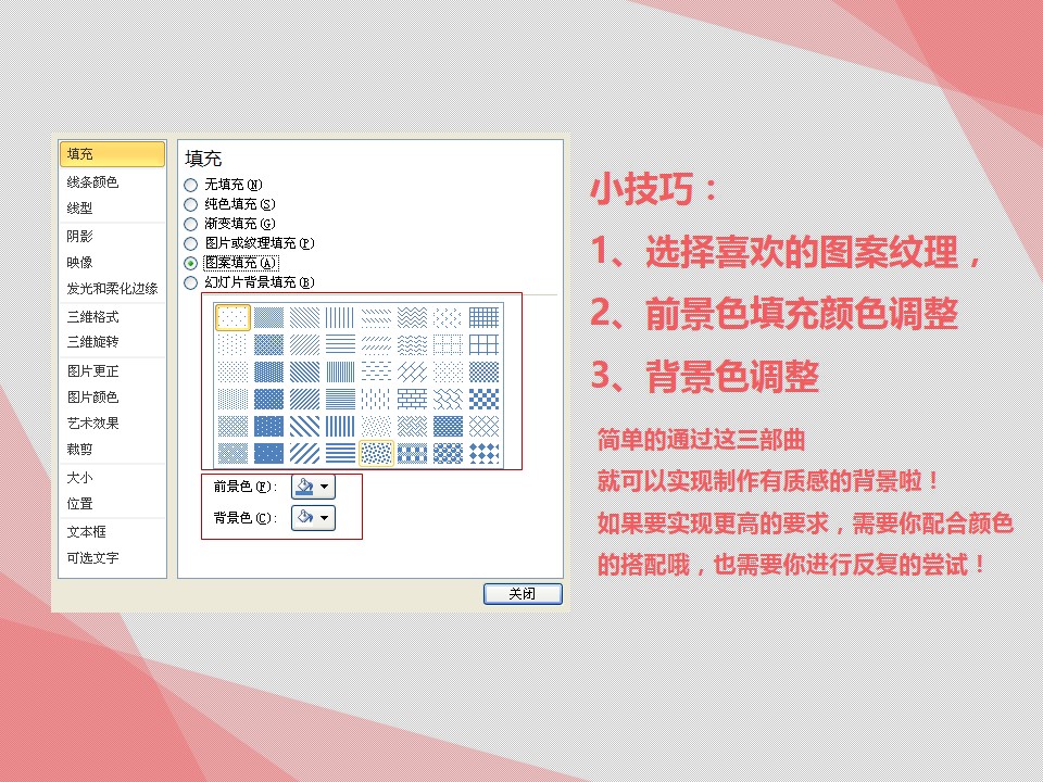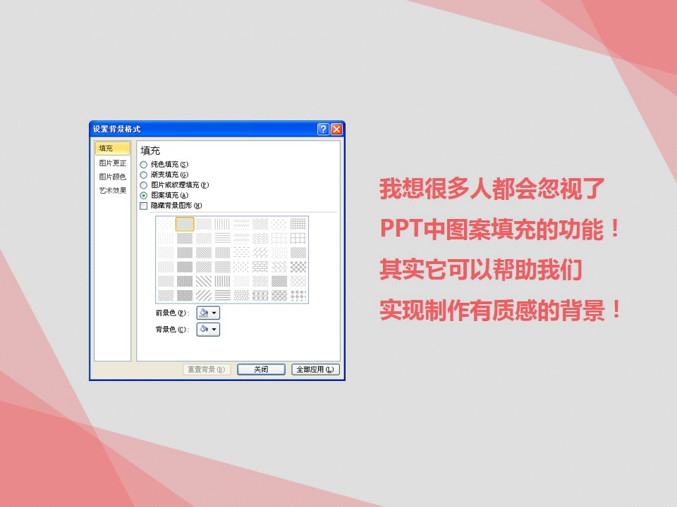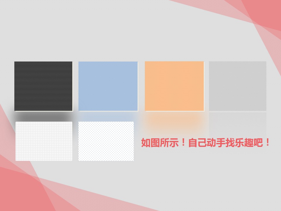 :如何设置有质感的背景,有质感的背景有时候可以更加凸显出PPT的档次、内容、主题前提当然是你运用得当!有质感的背景上哪找去?不用上百度、Google!PPT帮你实现!我想很多人都会忽视了,PPT中图案填充的功能!其实它可以帮助我们,实现制作有质感的背景!小技巧:1、选择喜欢的图案纹理,2、前景色填充颜色调整3、背景色调整,简单的通过这三部曲,就可以实现制作有质感的背景啦!如果要实现更高的要求,需要你配合颜色的搭配哦,也需要你进行反复的尝试!