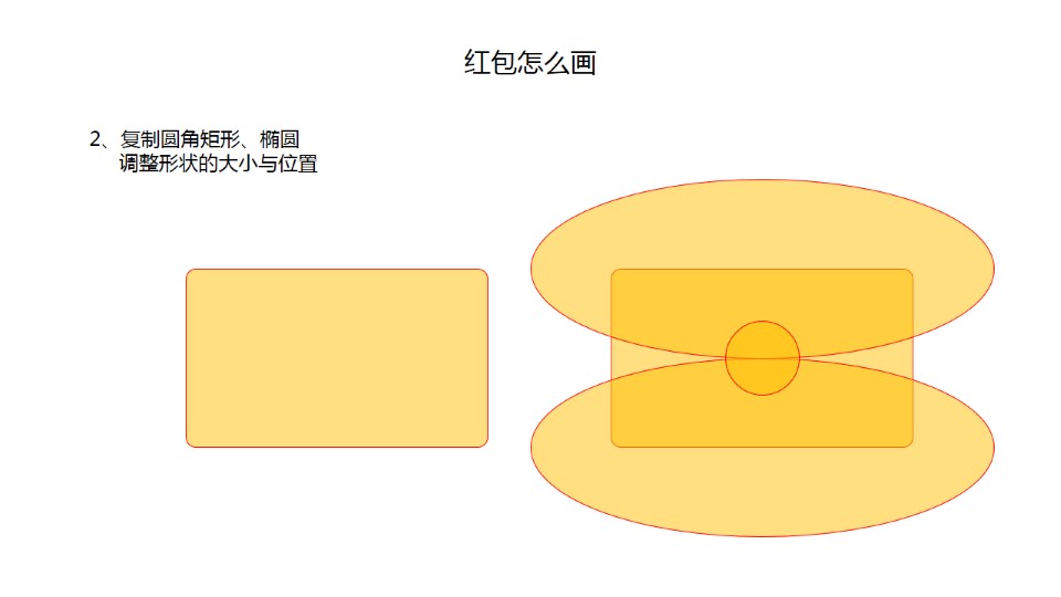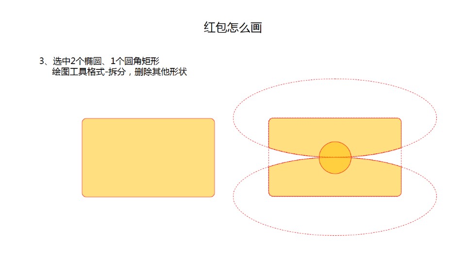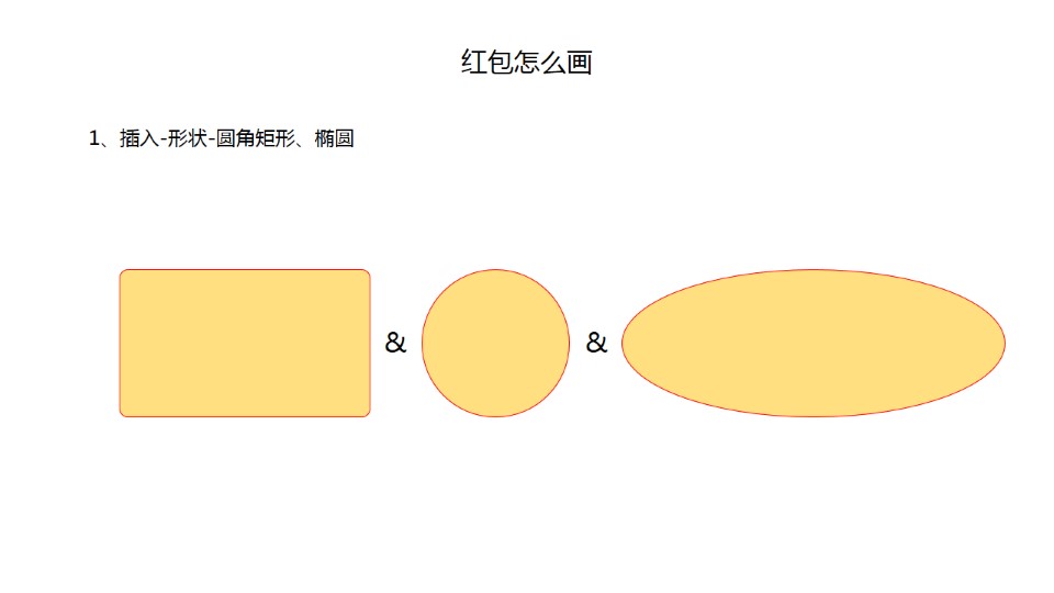 :红包 怎么画 ?1、插入-形状-圆角矩形、椭圆;2、复制圆角矩形、椭圆,调整形状的大小与位置;3、选中2个椭圆、1个圆角矩形绘图工具格式-拆分,删除其他形状;4、填充颜色、无轮廓;5、添加阴影,设置形状格式-效果-阴影;6、添加质感,设置形状格式-效果-三维格式;7、组合;猴子怎么画:1、插入-形状-椭圆按钮正圆和椭圆;2、画头部,1个正圆;3、画耳朵,2个正圆堆叠,复制后对称;4、画脸部,2个正圆和1个椭圆堆叠。