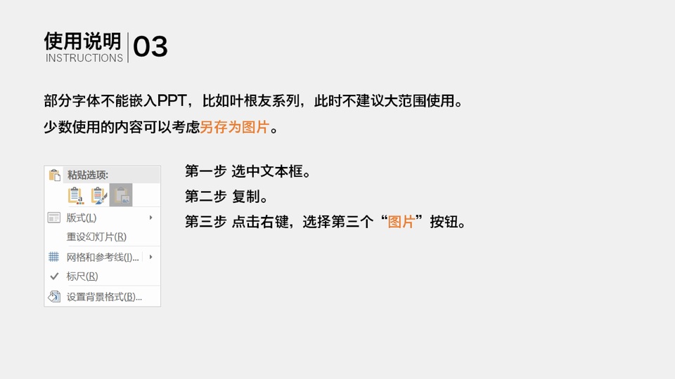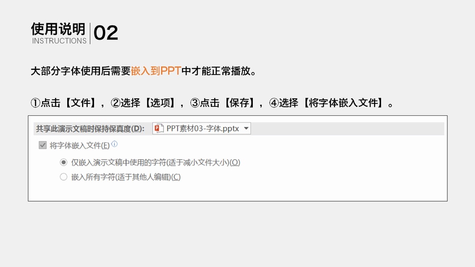 :字体使用手册,曹将私藏,使用说明01:改字体可能的其他显示名称,直接百度字体名称即可下载,改字体只适用于繁体字环境;02:大部分字体使用后需要嵌入到PPT中才能正常播放,点击“文件”,选择“选项”,点击“保存”,选择“将字体嵌入文件”。
