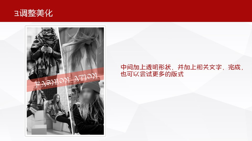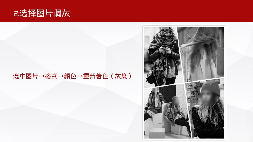 :没有彩色也“出彩”,1、插入素材并调整位置;2、选择图片灰度:选中图片>格式>颜色>重新着色(灰度);3、调整美化:中间加上透明形状,并加上相关文字,完成,也可以尝试更多的版式。