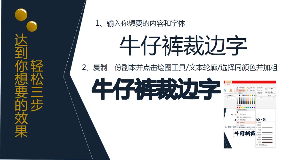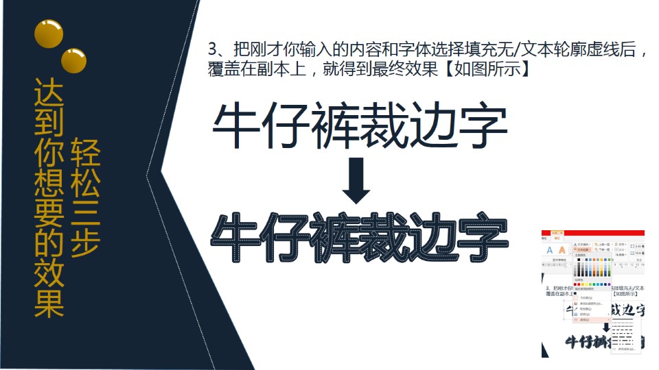 :牛仔裤裁边字教程,轻松三步达到你想要的效果:1、输入你想要的内容和字体;2、复制一份副本并点击绘图工具/文本轮廓/选择同颜色并加粗;3、把刚才你输入的内容和字体选择填充无/文本轮廓虚线后,覆盖在副本上,就得到最终效果【如图所示】。