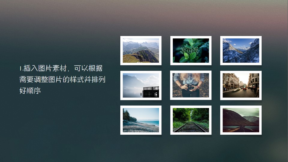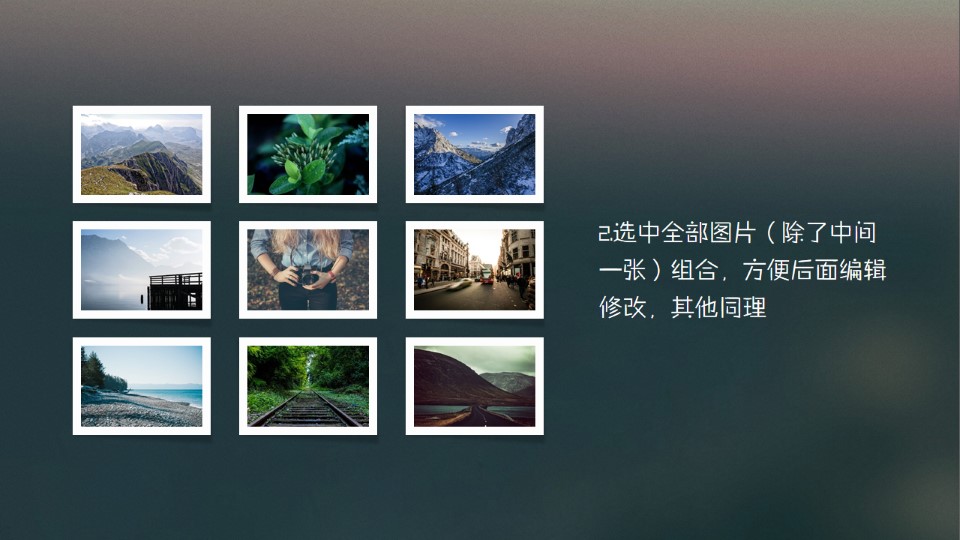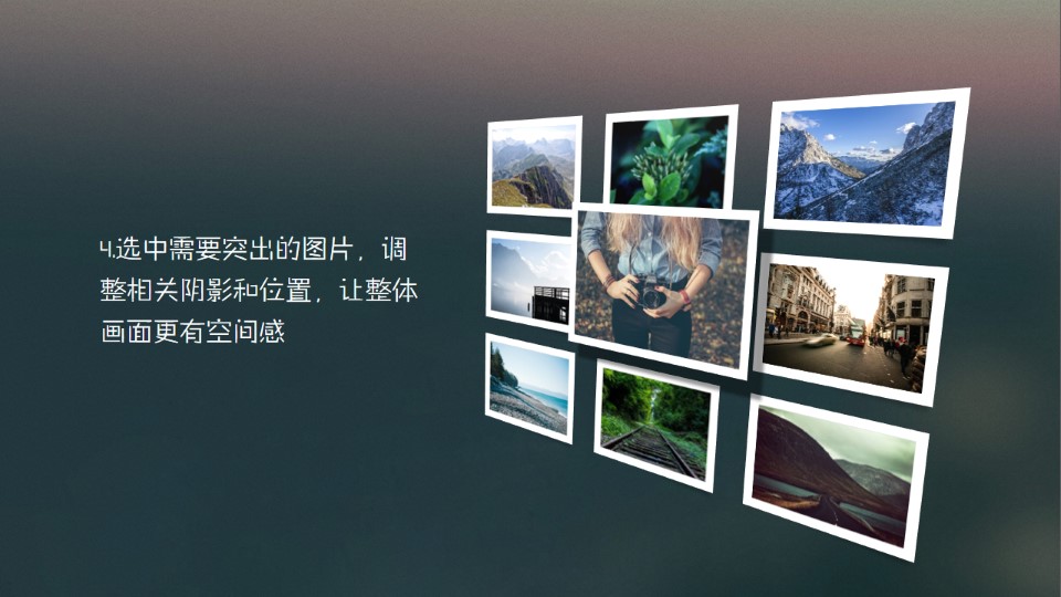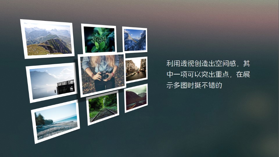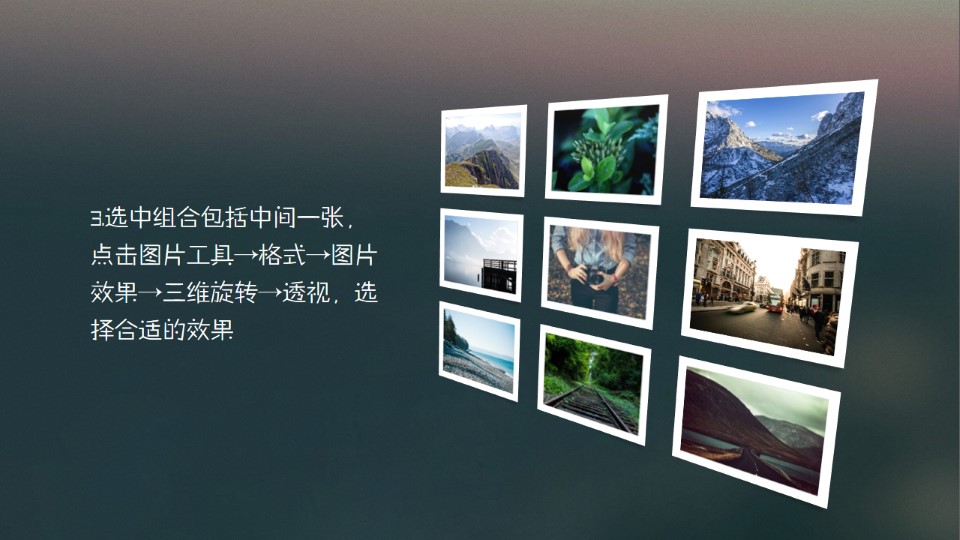 :利用透视创造空间感,利用透视创造出空间感,其中一项可以突出重点,在展示多图时挺不错的,1.插入图片素材,可以根据需要调整图片的样式并排列好顺序;2.选中全部图片(除了中间一张)组合,方便后面编辑修改,其他同理;3.选中组合包括中间一张,点击图片工具→格式→图片效果→三维旋转→透视,选择合适的效果;4.选中需要突出的图片,调整相关阴影和位置,让整体画面更有空间感。