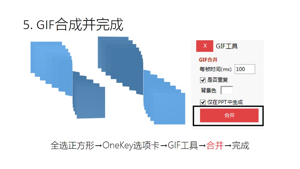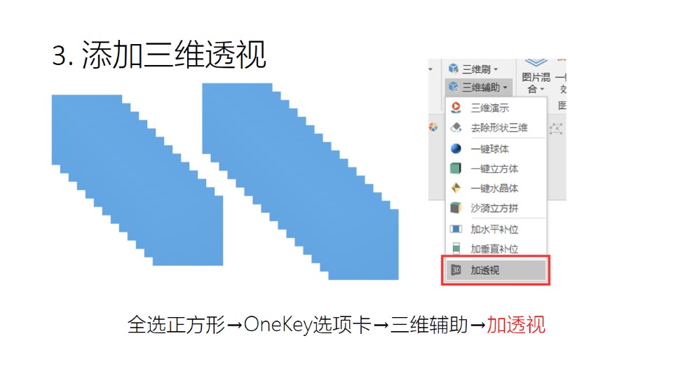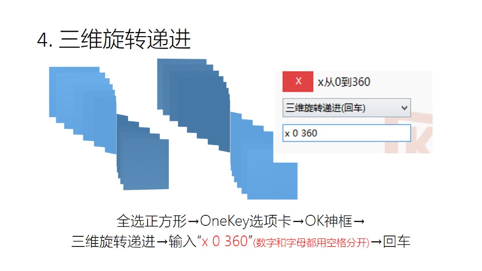 :GIF单图旋转轻松做:1. 插入形状:OneKey选项卡→插入形状;2. Ctrl+D复制:选中正方形→Ctrl+D复制多个;3. 添加三维透视:全选正方形→OneKey选项卡→三维辅助→加透视;4. 三维旋转递进:全选正方形→OneKey选项卡→OK神框→三维旋转递进→输入“x 0 360”(数字和字母都用空格分开)→回车;5. GIF合成并完成:全选正方形→OneKey选项卡→GIF工具→合并→完成。