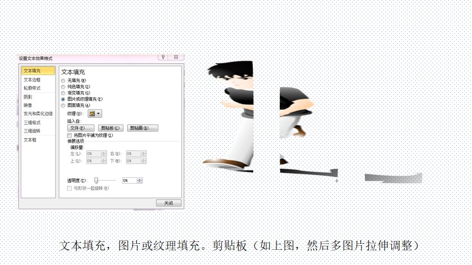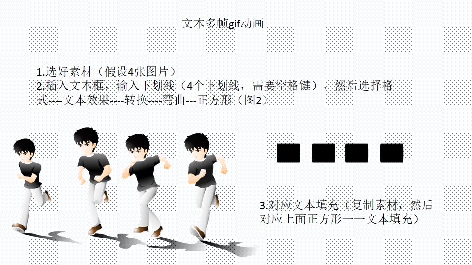 导读:文本多帧gif动画,1.选好素材(假设4张图片)2.插入文本框,输入下划线(4个下划线,需要空格键),然后选择格式----文本效果----转换----弯曲---正方形(图2)3.对应文本填充(复制素材,然后对应上面正方形一一文本填充),文本填充,图片或纹理填充。剪贴板(如上图,然后多图片拉伸调整),4.调整文本距离-----字符距离,5.动画,添加闪烁一下,然后对动画进行设置(如图),说明:下划线,主要是通过下划线艺术字转换,变成正方形,通过正方形来实现文本填充。