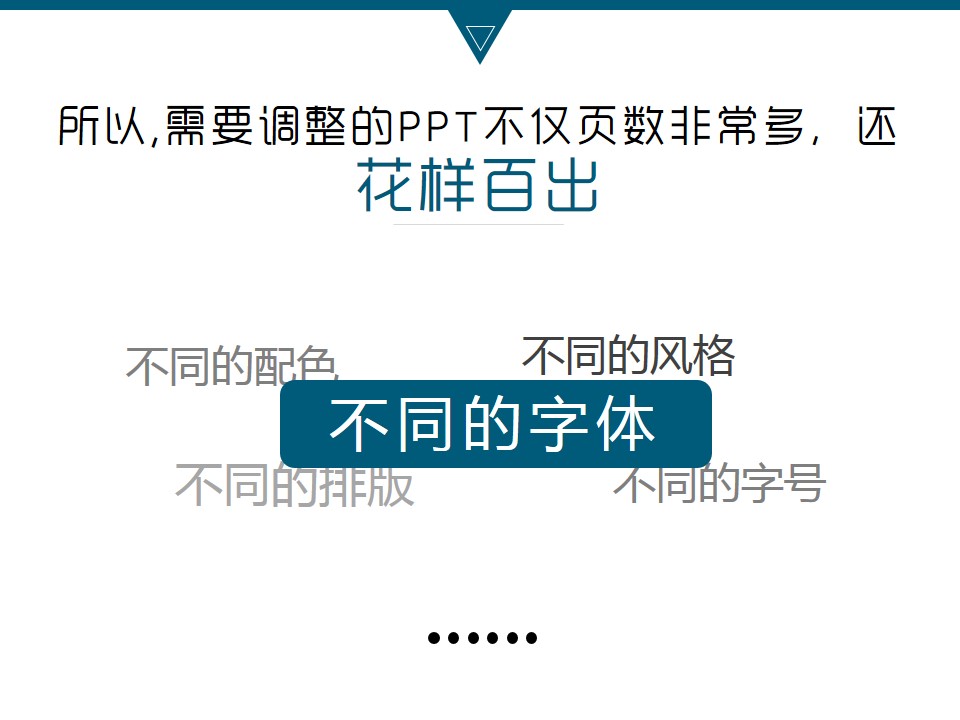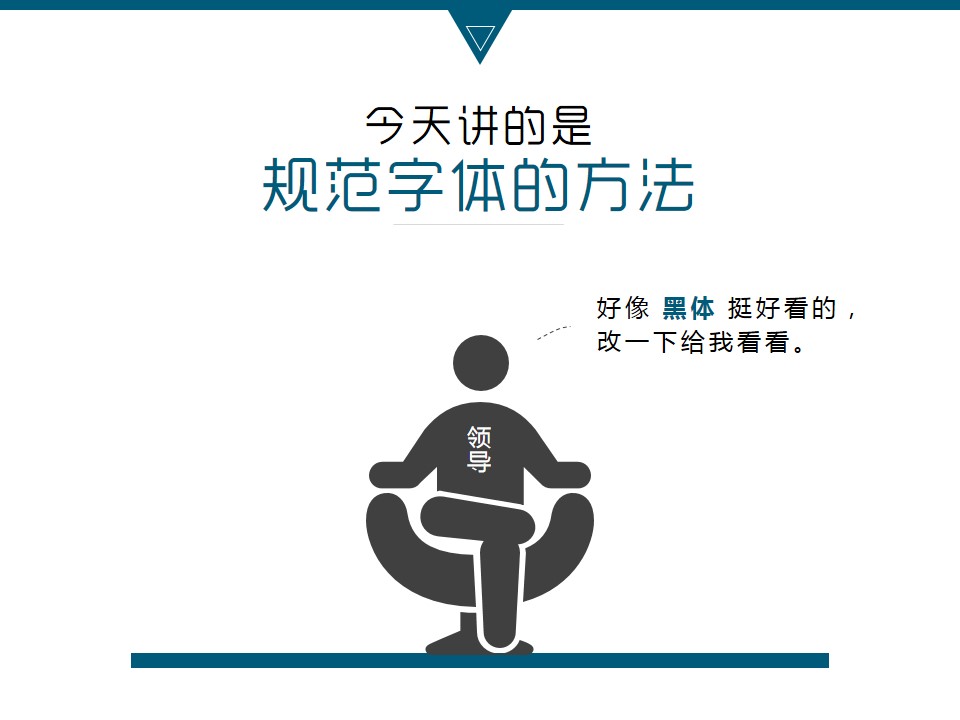 :呆鱼在工作经常碰到,这种情况,这个PPT帮我改一下收到的PPT基本是这样的,我分析了一下原因:一份PPT经常汇总于多个部门,汇报的PPT,小A,市场模块你做下。研发模板小B做下,然后给我汇总。所以,需要调整的PPT不仅页数非常多,还花样百出:不同的配色,不同的风格,不同的排版,不同的字号,不同的字体,今天讲的是规范字体的方法,好像 黑体 挺好看的,改一下给我看看。