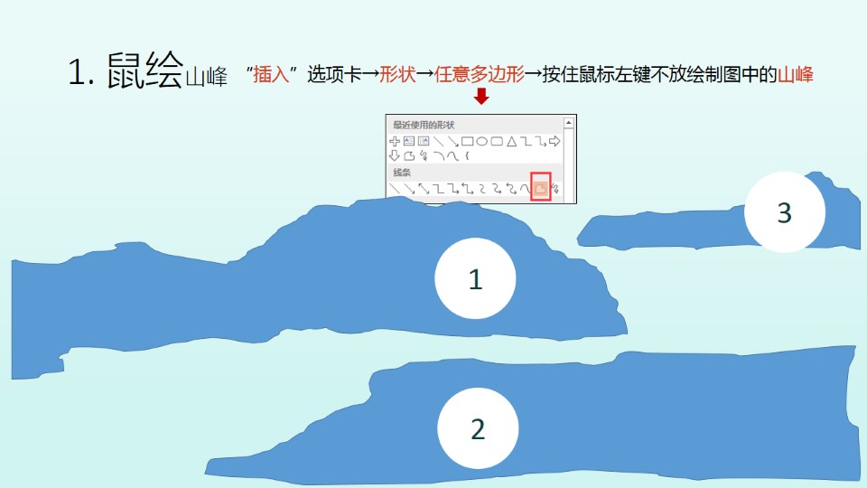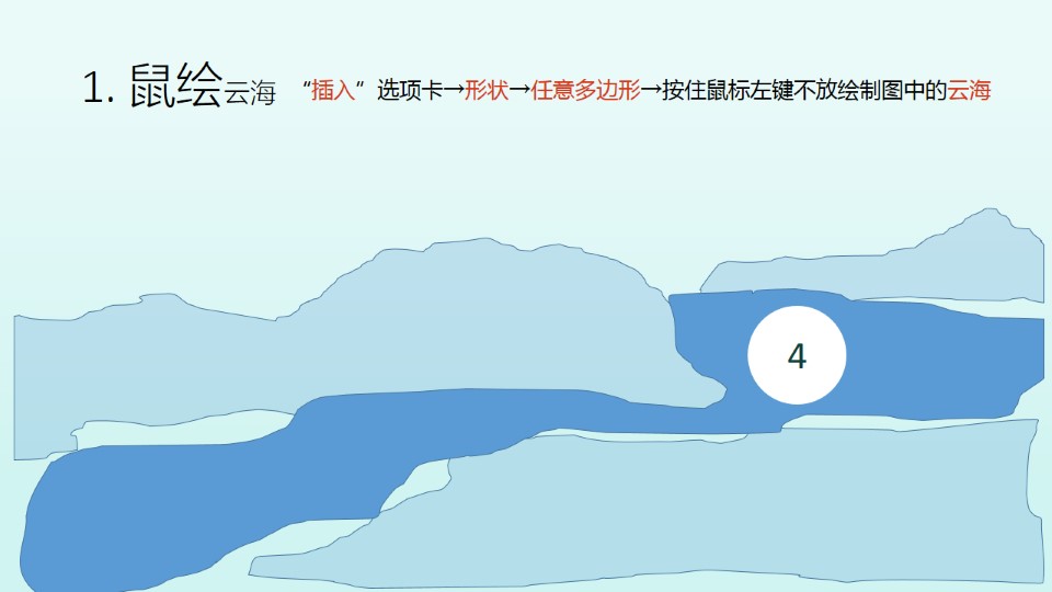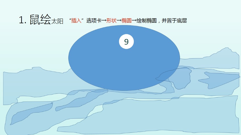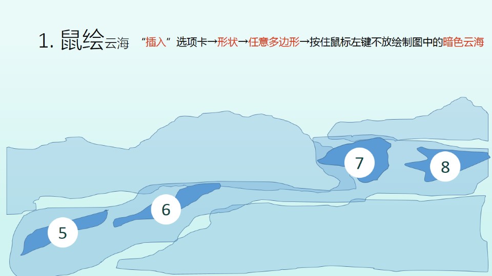 :所用PPT功能鼠绘+纯色,渐变,阴影,1. 鼠绘山峰:“插入”选项卡→形状→任意多边形→按住鼠标左键不放绘制图中的山峰;1. 鼠绘云海:“插入”选项卡→形状→任意多边形→按住鼠标左键不放绘制图中的云海;“插入”选项卡→形状→任意多边形→按住鼠标左键不放绘制图中的暗色云海;1. 鼠绘太阳:“插入”选项卡→形状→椭圆→绘制椭圆,并置于底层;2. 上色:“插入”选项卡→形状→椭圆→绘制椭圆并置于底层。