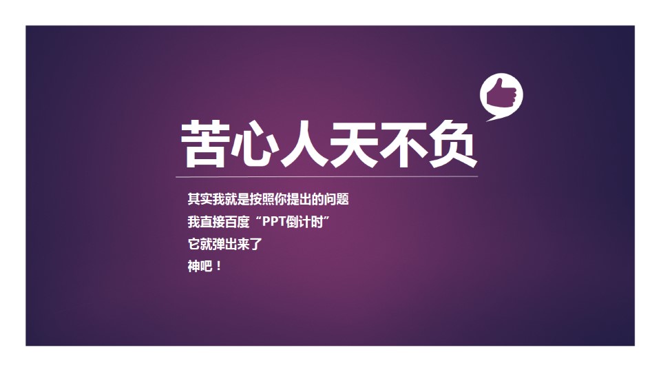 :PPT辅助软件推荐,By:@花生PPTer,破,大神!PPT中怎么插入倒计时肿么破?百度,其实!我也不知道!我把百度给上了!所以请别叫我大神,先跟百度谈恋爱先吧!苦心人天不负,其实我就是按照你提出的问题,我直接百度“PPT倒计时”它就弹出来了神吧!