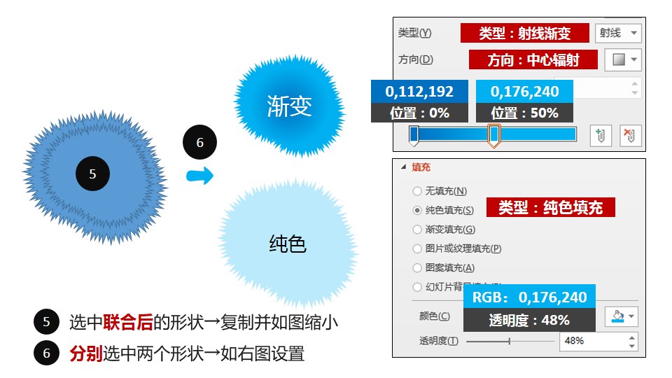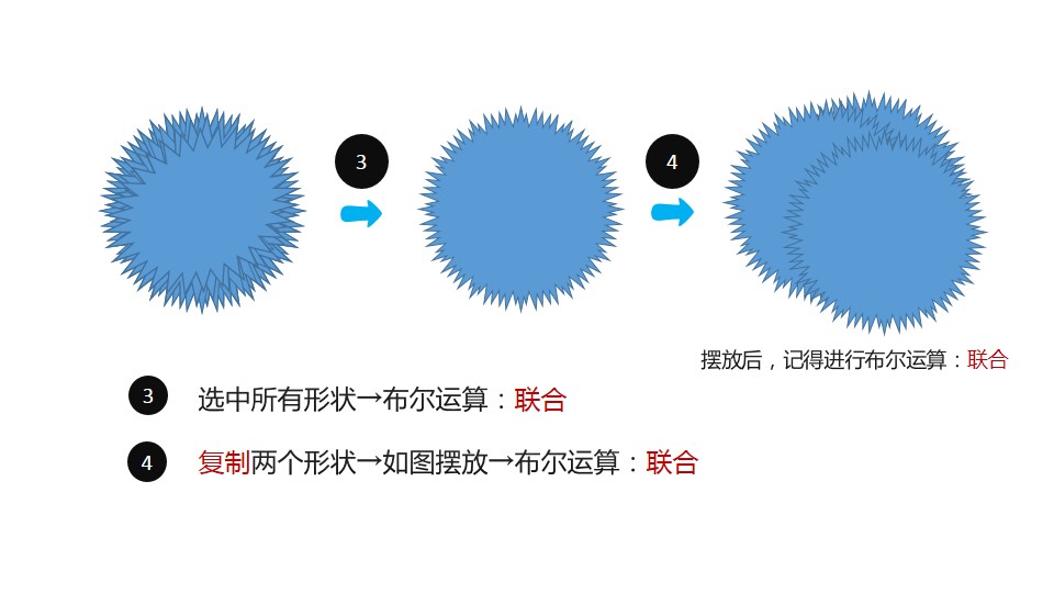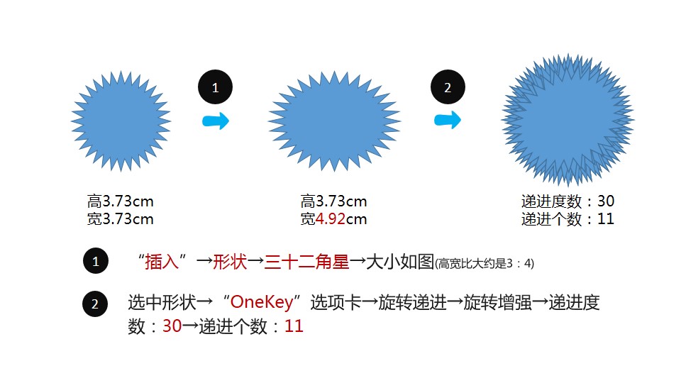 :1、“插入”→形状→三十二角星→大小如图(高宽比大约是3:4);2、选中形状→“OneKey”选项卡→旋转递进→旋转增强→递进度数:30→递进个数:11;3、选中所有形状→布尔运算:联合;4、复制两个形状→如图摆放→布尔运算:联合;5、选中联合后的形状→复制并如图缩小;6、分别选中两个形状→如右图设置。