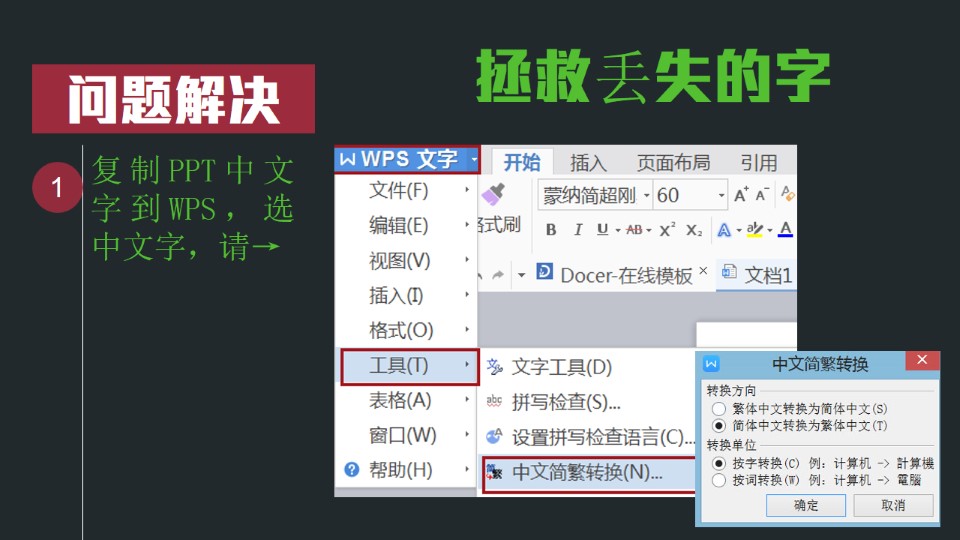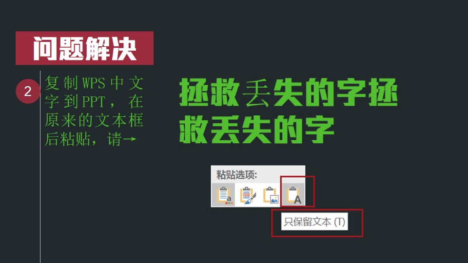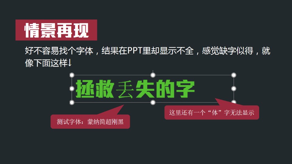 :拯救丢失的字体,背景再现,好不容易找到字体,结果在ppt里却显示不全,感觉缺字体似得,就像下面这样,说好的字体呢,明明就是常见字,你需要一枚“WPS文字”,问题解决:1、复制PPT中文字体到wps,选择中文字;2、复制WPS中文字到PPT,在原来的文本框后粘贴。