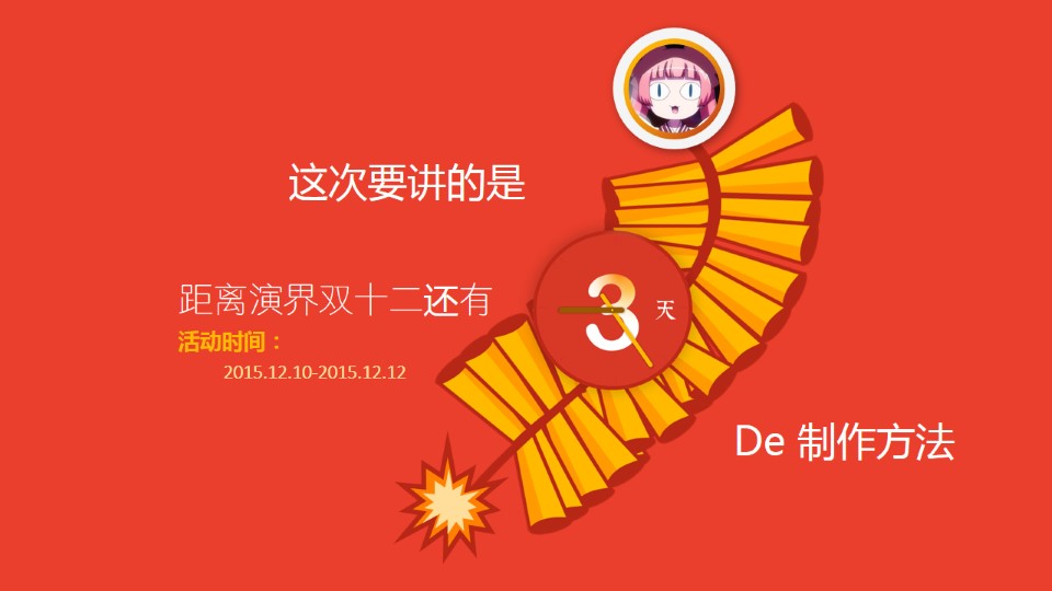 :距离演界双十二还有3天,倒计时ICON的制作,壹:倒计时表盘的制作,绘制等大的两个圆,输入你的倒计时日期,数字字体可根据自己喜欢选择,将数字居中放置在圆上,同时选中数字和圆,切换到格式菜单→合并形状→选择“组合”,同时准备好渐变圆点缀,添加阴影,添加指针、刻度和单位;贰:爆竹的制作,绘制一条粗粗的曲线,绘制一个梯形,利用编辑顶点,很多爆竹,线条,组合应用。