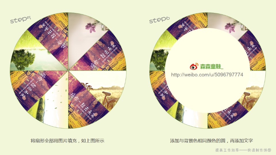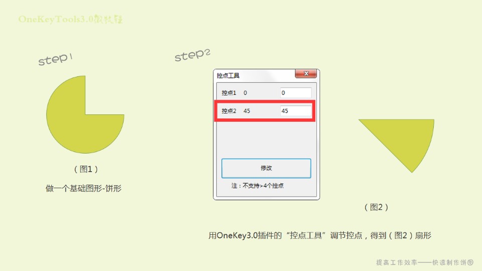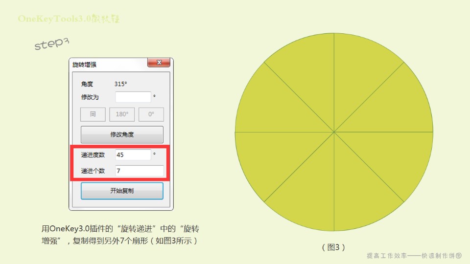 :控点工具,旋转递进,旋转增强,第一步:做一个基础图形-饼形;第二步:用OneKey3.0插件的“控点工具”调节控点,得到(图2)扇形;第三步:用OneKey3.0插件的“旋转递进”中的“旋转增强”,复制得到另外7个扇形(如图3所示);第四步:将扇形逐一用图片填充;第五步:将扇形全部用图片填充,如上图所示;第六步:添加与背景色相同颜色的圆,再添加文字。