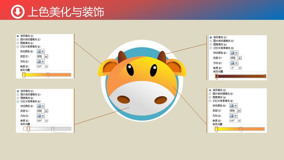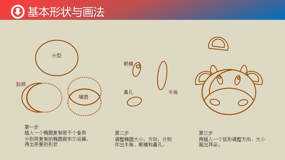 :基本形状与画法,第一步:插入一个椭圆复制若干个备用分别用复制的椭圆做个布尔运算,得出所要的形状;第二步:调整椭圆大小、方向、分别作出牛角、眼睛和鼻孔;第三步:再插入一个弦形调整方向、大小画出耳朵;上色美化与装饰;画法拓展与举例。