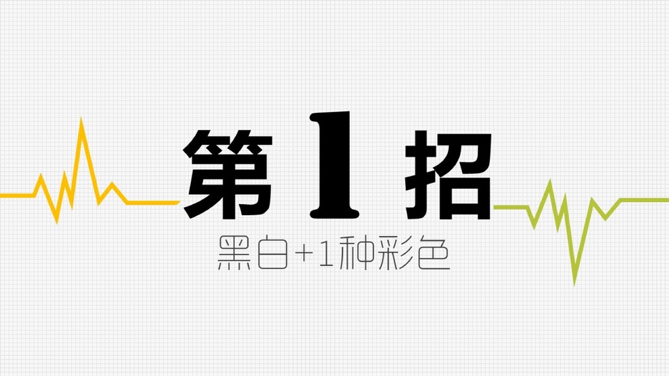 :让我们来感受一下配色的重要性,明白了?让我们从最简单的做起,第一招:黑色+一种彩色:01、选择一个你最喜欢的颜色,配上黑和白,不会让你失望,简洁大气,大面积使用色块,更加精彩,而且画面并不会单调,想要炫酷感,就加上一个黑白的应景底图,如果你学会了,调整颜色的透明度的话,那PPT兼职就非常非常饱满了。