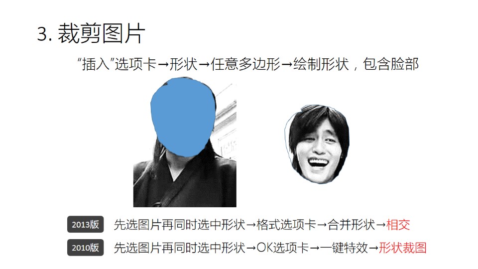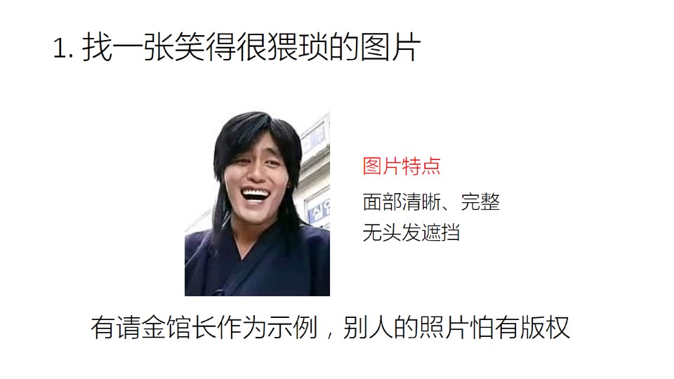 导读:1. 找一张笑得很猥琐的图片,图片特点:面部清晰、完整、无头发遮挡,有请金馆长作为示例,别人的照片怕有版权;2. 调图片三度-1:选中图片右键→设置图片格式→图片颜色→饱和度:0;2. 调图片三度-2:选中图片右键→设置图片格式→图片更正→对比度:30;2. 调图片三度-3:选中图片右键→设置图片格式→图片更正→亮度:20;3. 裁剪图片:“插入”选项卡→形状→任意多边形→绘制形状,包含脸部;2013版:先选图片再同时选中形状→格式选项卡→合并形状→相交;2010版:先选图片再同时选中形状→OK选项卡→一键特效→形状裁图。