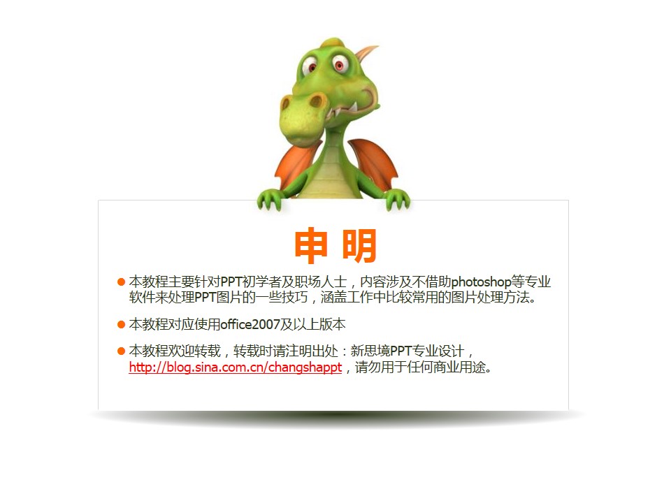:PPT实用图像处理技巧,本教程不借助任何Photoshop等图像处理软件:1、导入图片(缩放、裁切、抠图);2、调整图片(亮度、对比度、着色);3、特殊效果(投影、发光、三维)4、图片压缩(PPT减肥);1.1 插入图片的两种方法;1.2 缩放、旋转图片1.3 裁切图片1.4 抠图。