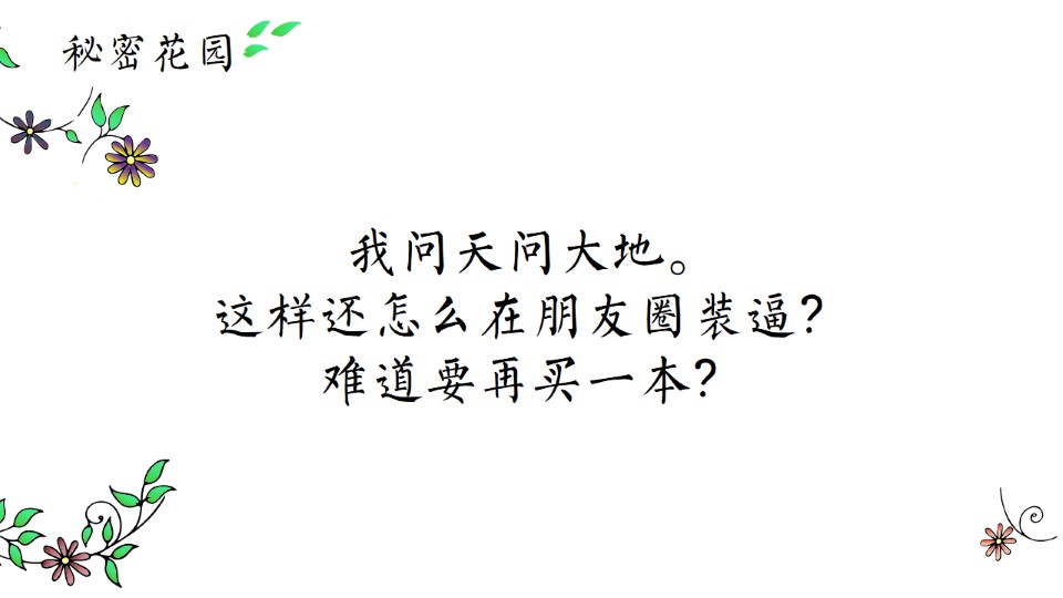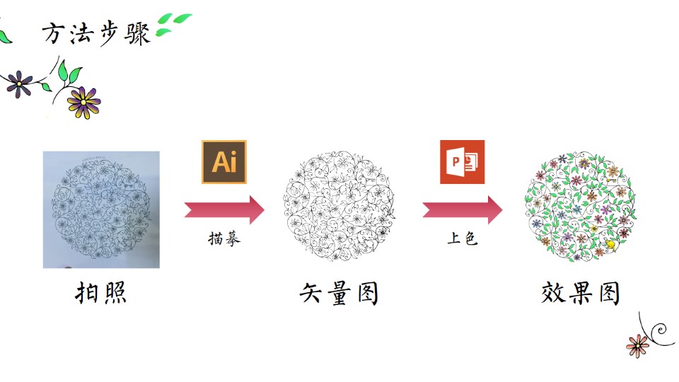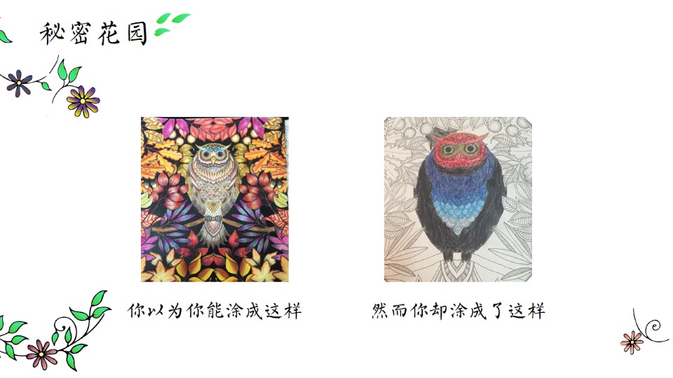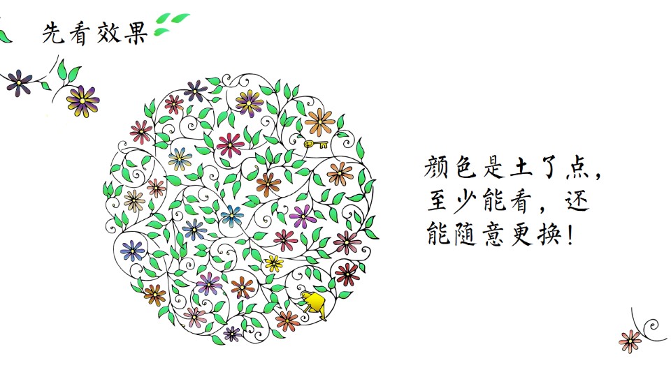 :在PPT里玩秘密花园,颜色是土了点,至少能看,还能随意更换!你以为你能涂成这样,然而你却涂成了这样,我问天问大地,这样还怎么在朋友圈装逼?难道要再买一本?答案当然是不!让我一步一步地来教你如何摩擦,拍照>描摹 >矢量图>上色>效果图.