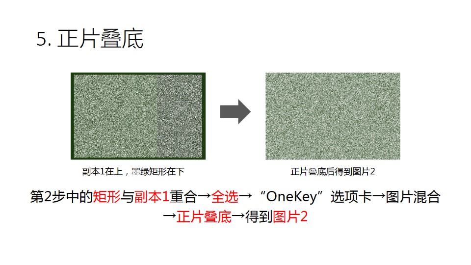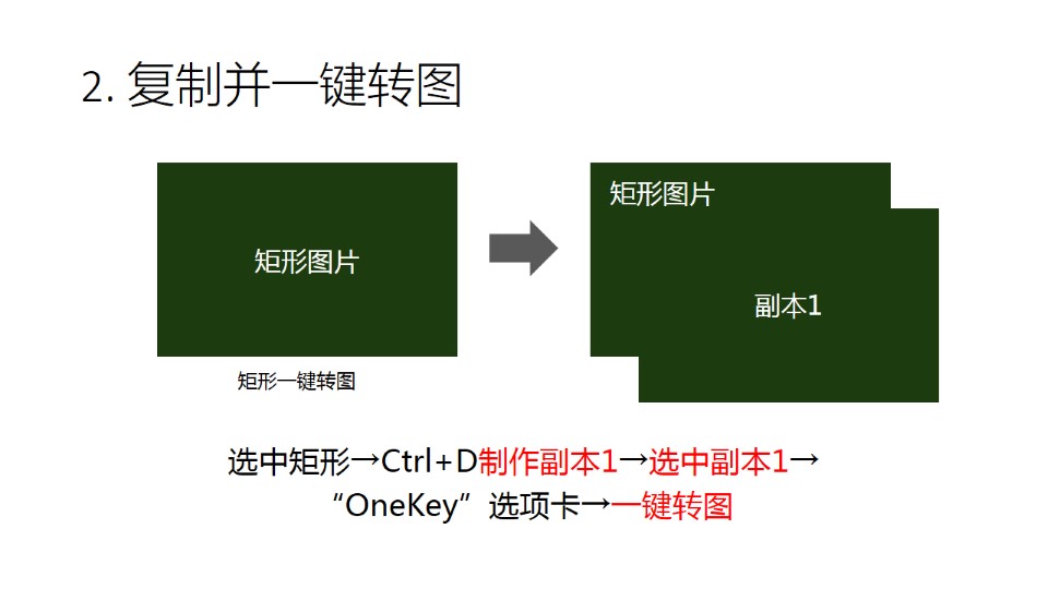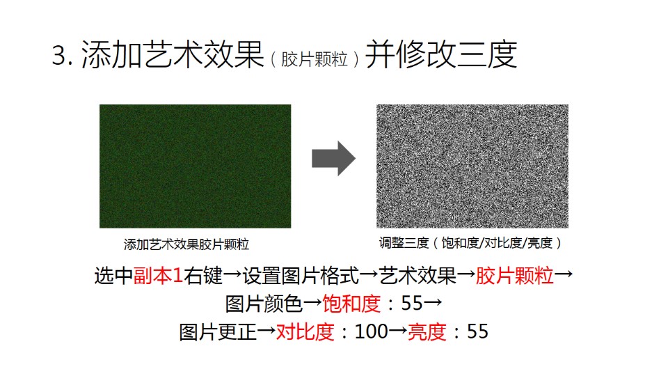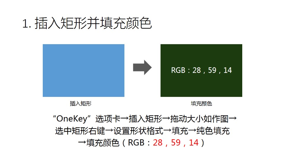 :1. 插入矩形并填充颜色:OneKey”选项卡→插入矩形→拖动大小如作图→选中矩形右键→设置形状格式→填充→纯色填充→填充颜色(RGB:28,59,14);2. 复制并一键转图:选中矩形→Ctrl+D制作副本1→选中副本1→“OneKey”选项卡→一键转图;3. 添加艺术效果(胶片颗粒)并修改三度:选中副本1右键→设置图片格式→艺术效果→胶片颗粒→图片颜色→饱和度:55→图片更正→对比度:100→亮度:55。